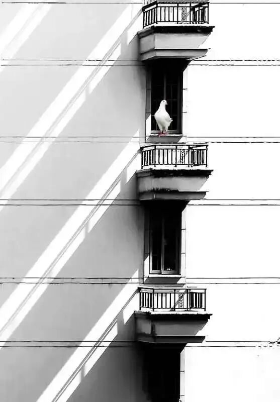 拍摄说明:一个周末的午后站在阳台上放眼望向对面的高楼,哇,好美的光影,只见一条条极有秩序的光影投射在对面高楼外墙上,视线跟随光线的引导,被一户人家窗台上的鸽子吸引,美不胜收,于是记录下了这美好的一幕