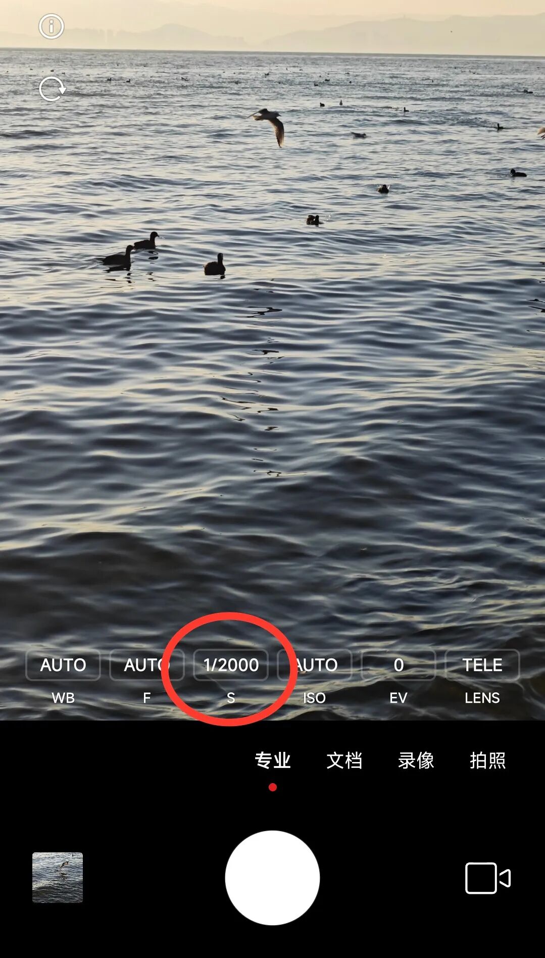 由于海鸥飞起的速度很快,如果用常规模式拍,快门速度不够快,很难拍到海鸥展翅飞翔的瞬间,所以要用专业模式调参数。主要把快门速度调到1/2000秒左右,其他参数自动就好。