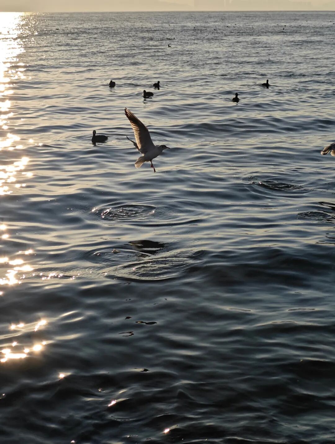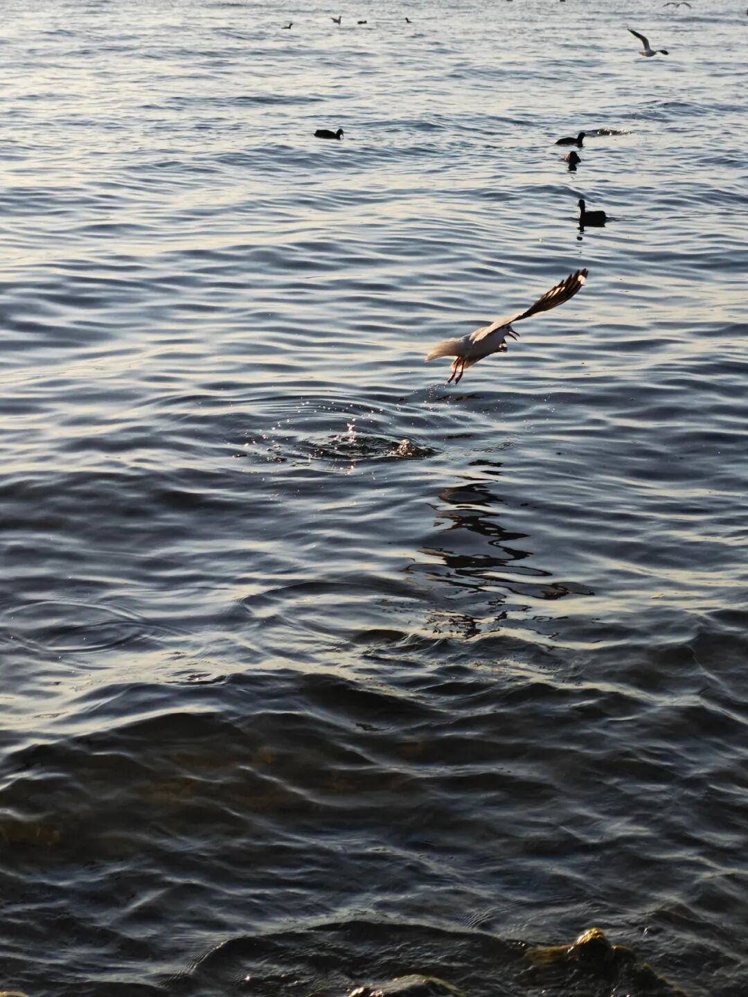 画面很杂乱,逆光拍摄太阳也过曝了,所以一定要拉近构图,当时我是变焦了3倍,取局部干净的水面做背景,只拍摄1只海鸥做主体。
