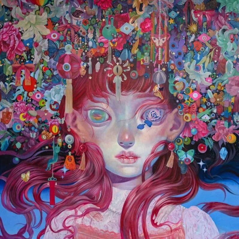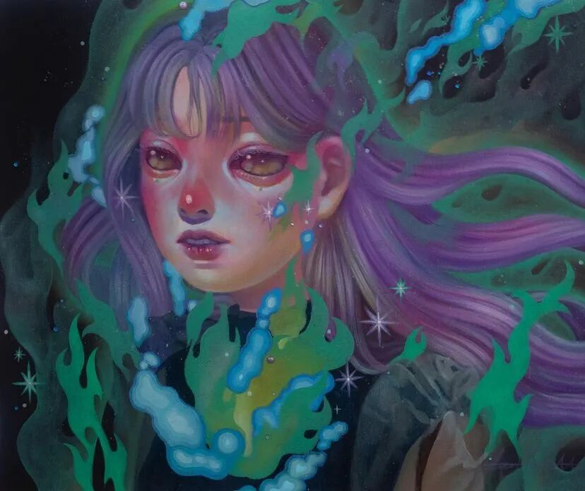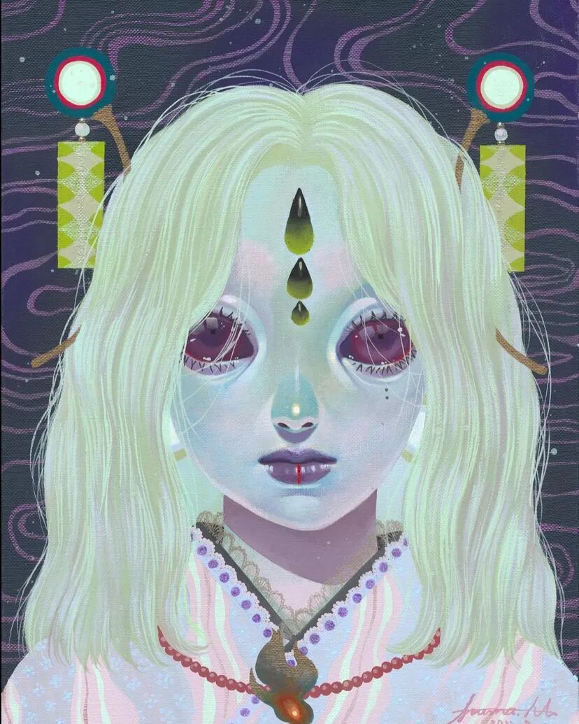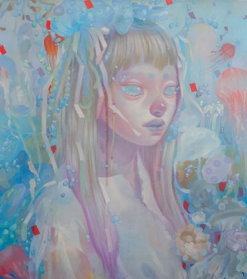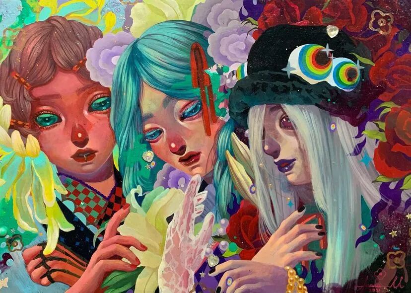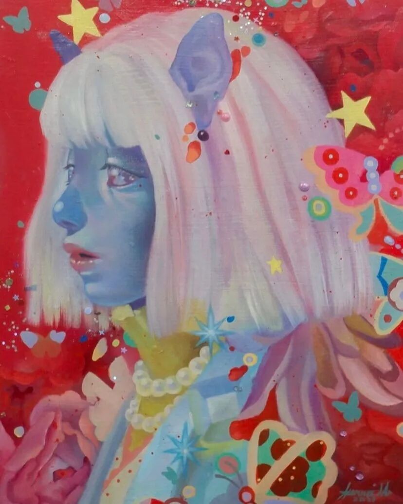 丸山纯奈擅长将色彩绚丽与暗黑忧郁的氛围融合在一起,表达青春期少女的小忧郁。她的作品在夸张可爱的二维漫画形象背后,通过魔幻化的符号语言,呈现人们常常逃避、忽视的社会负面情感。