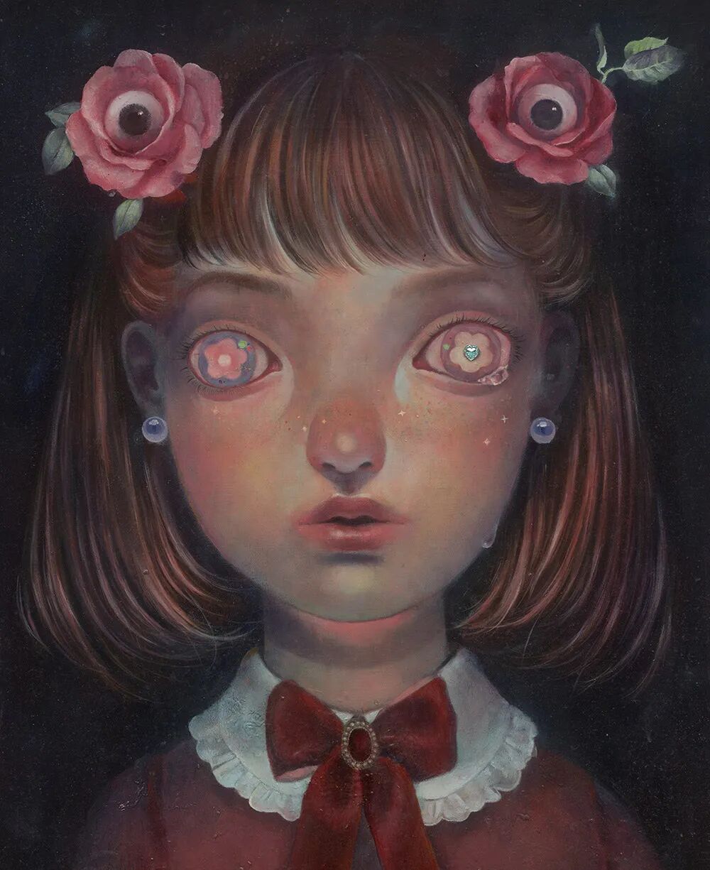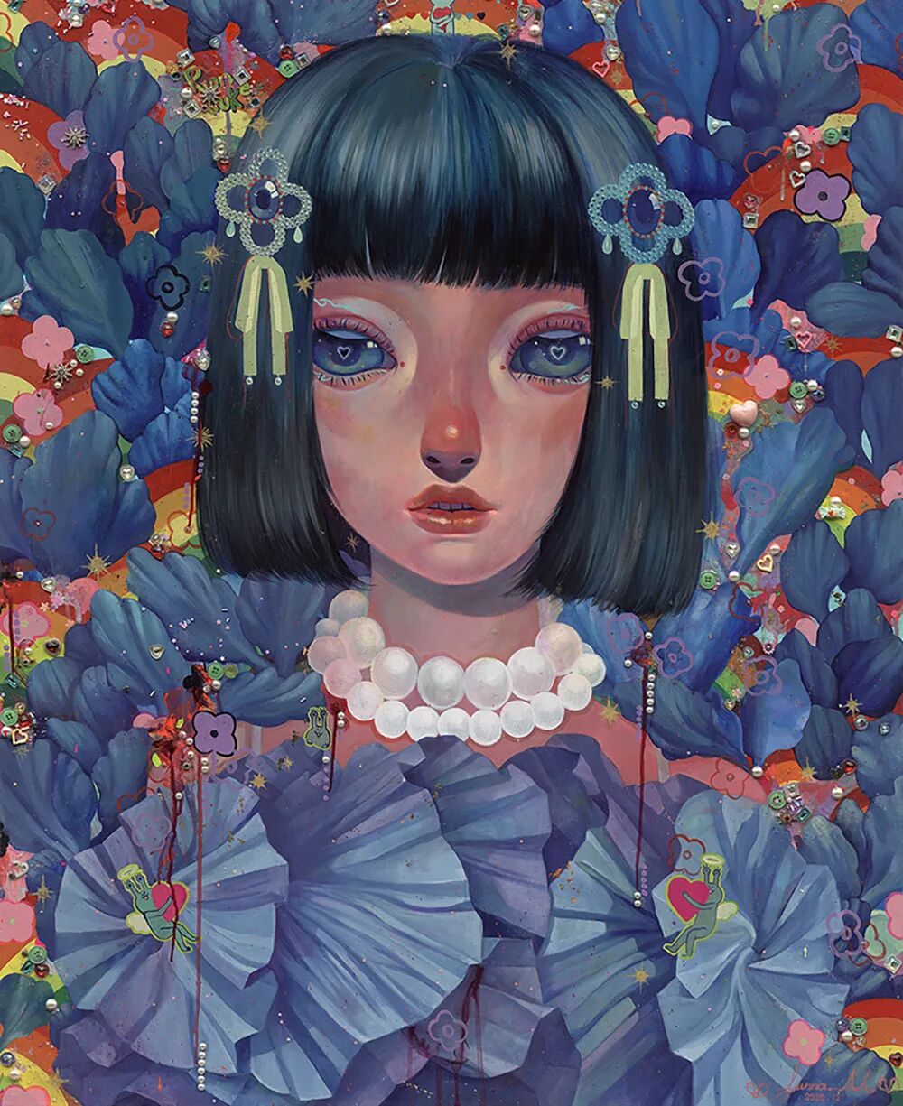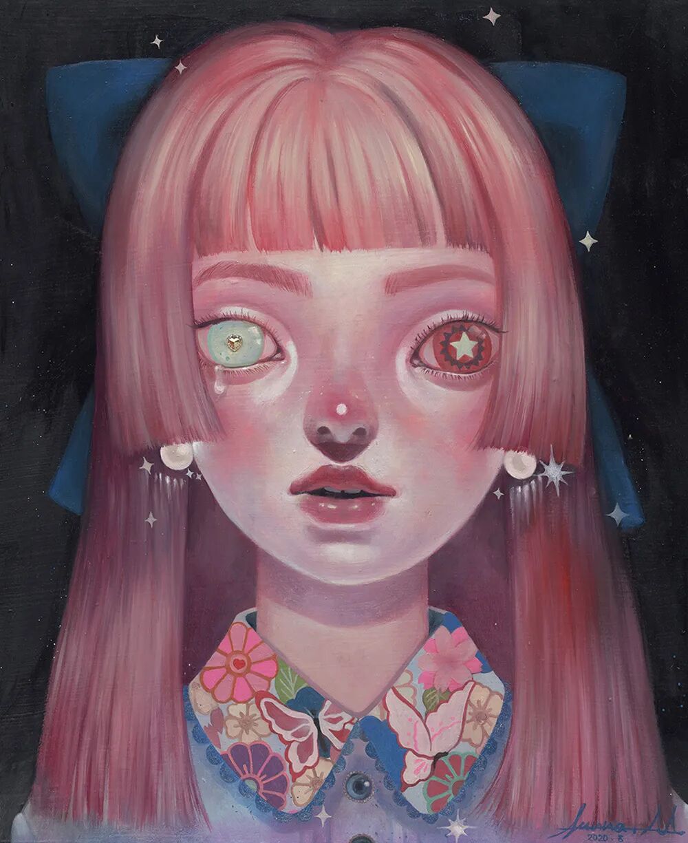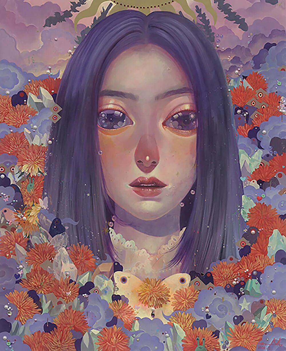 丸山纯奈擅长将色彩绚丽与暗黑忧郁的氛围融合在一起,表达青春期少女的小忧郁。她的作品在夸张可爱的二维漫画形象背后,通过魔幻化的符号语言,呈现人们常常逃避、忽视的社会负面情感。