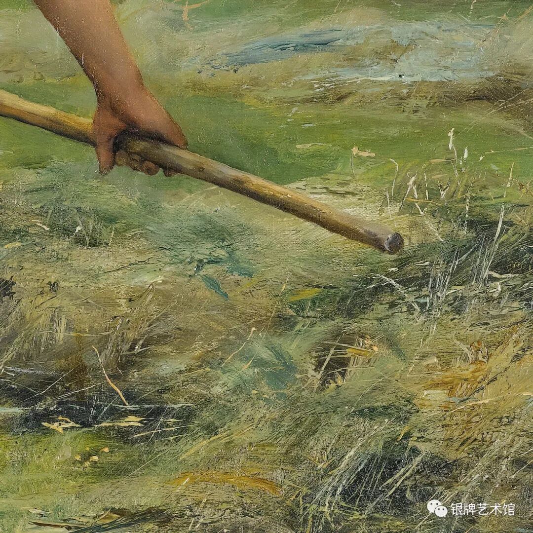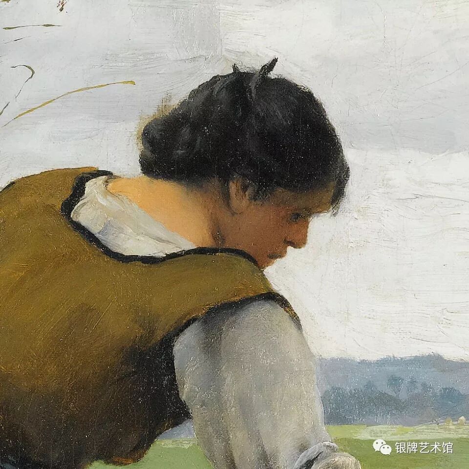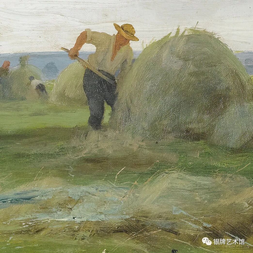 这是一幅描绘农民日常劳作的现实主义作品,其风格介于19世纪末学院派和印象派之间,和他同为画家的岳父、妻叔和妻兄属同一流派。