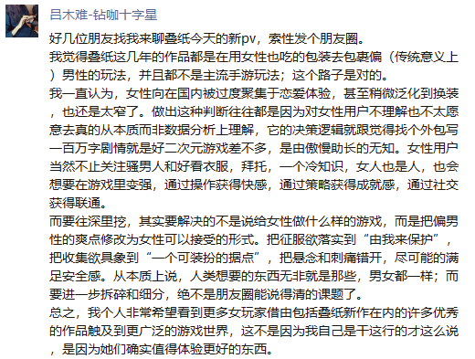 十字星创始人吕木难(钻咖)今天便在朋友圈表示,“女人也会想通过操作获得快感,通过策略获得成就感,通过社交获得联通。”毕竟如果抛开性别,男人女人也没什么不同。