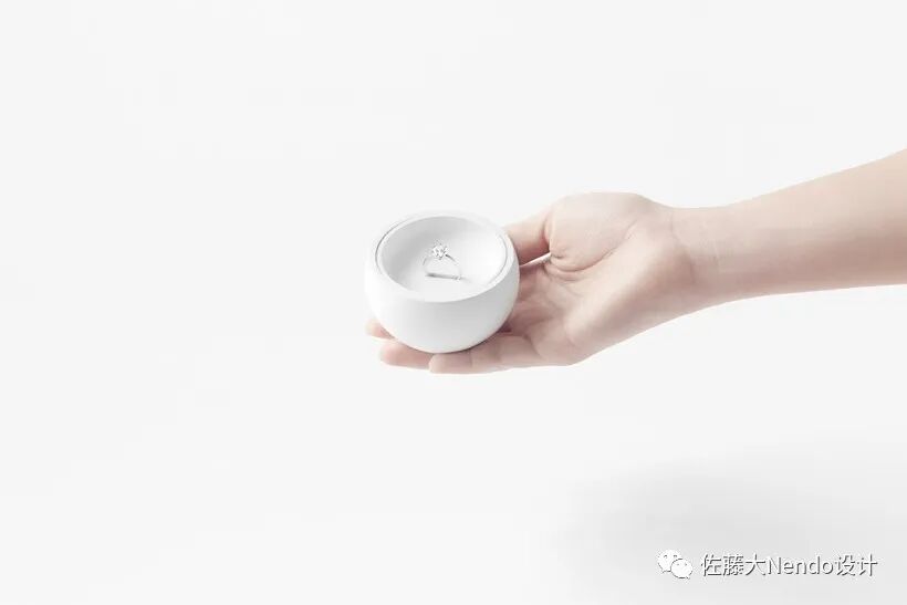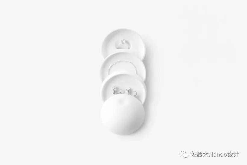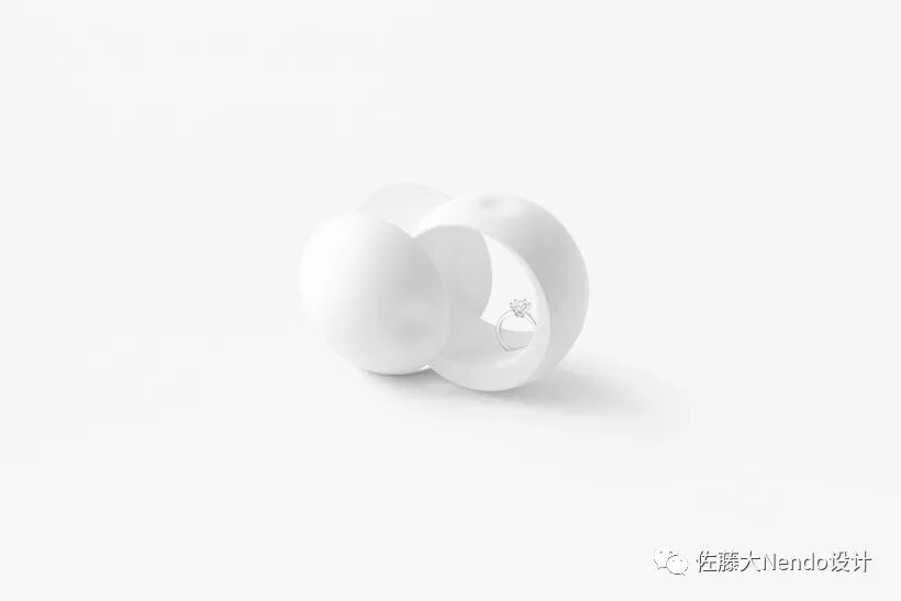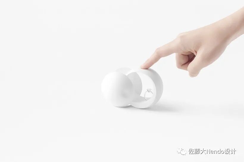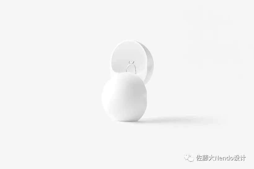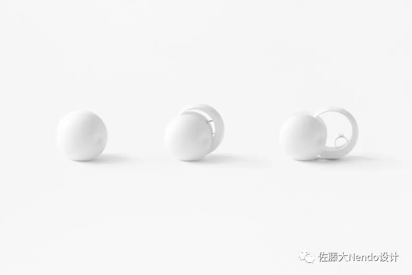 The search of a new application for this material and its special qualities hasled to the design of this collection. When closed, all white cases have the same sphere shape of 65mm in diameter, but slight indentations are located differently on each of them. These indentation marks serve as a clue as to how the boxes open, and each case slides open in its unique way revealing the jewelryplaced within.对