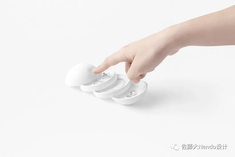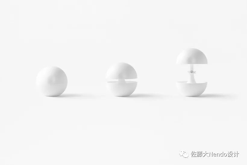 这种材料的新应用及其特殊特性的探索导致了这个系列的设计。当关闭时,所有的白色外壳都是相同的直径为65mm的球体形状,但是在每个外壳上都有细微的凹痕。这些压痕标志作为一个线索,如何打开的箱子,和每个盒子滑动打开,以其独特的方式显示珠宝放置在里面。