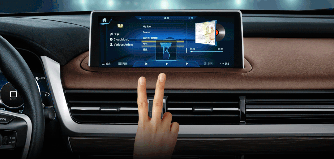 在车内任何一个位置都可以用简单易行的手势控制大屏,对其信息进行打开、关闭、挪动等,还可以用手抓取一个地点,抛进大屏中央的地图里,即可启动导航。
