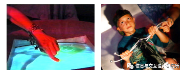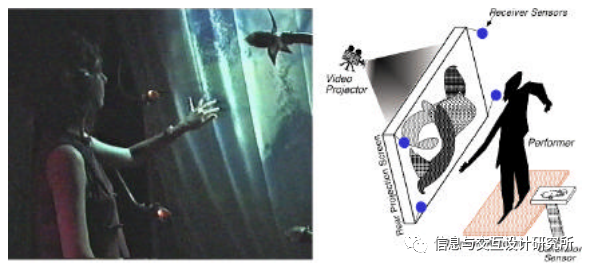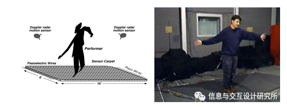 鼓垫与手势装置,手势墙使用发射模式电场传感器(Paradiso和Gershenfeld 1997)来测量用户在投影屏幕前的位置和身体运动。左侧所示为其运行状态;在大脑歌剧中有五个手势墙。
