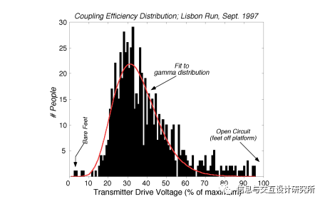 当信号通过脚部传输到人体时,鞋底的复杂阻抗对耦合效率有很大的影响,从而影响信号强度。这不仅取决于鞋底的大小和厚度,而且最重要的是取决于鞋底的材料和成分,因此每双鞋的差异很大,因此需要补偿。为了解决这个问题,我们让玩家在踩上传输电极后,首先将一只手平放在校准板上,测量通过鞋底流入身体的电流。在校准期间(需要不到一秒的时间),变送器的输出电压被伺服控制,以驱动该电流到一个固定的参考点,从而消除鞋阻抗的影响,使每个人或多或少地具有相同的效率变送器。