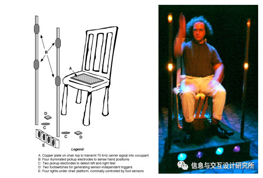 在观众面前演奏的“大脑歌剧”部分是由一个三人组演奏的,每个人都使用不同的定制电子乐器。其中之一,“手势树”(在图14中可见),是上一节描述的两种交互工具的简单混合。一袋“节奏树”(Rhythm Tree)垫可以实现敲击和触觉触发声音,然后通过挥舞手臂绕过安装在上面的四个“手势墙”传感器(表演者站在发射板上),以各种方式对声音进行修改。虽然这种乐器通常是徒手演奏的,但有些表演者使用金属鼓槌,手势墙的拾音器也会对金属鼓槌做出回应。