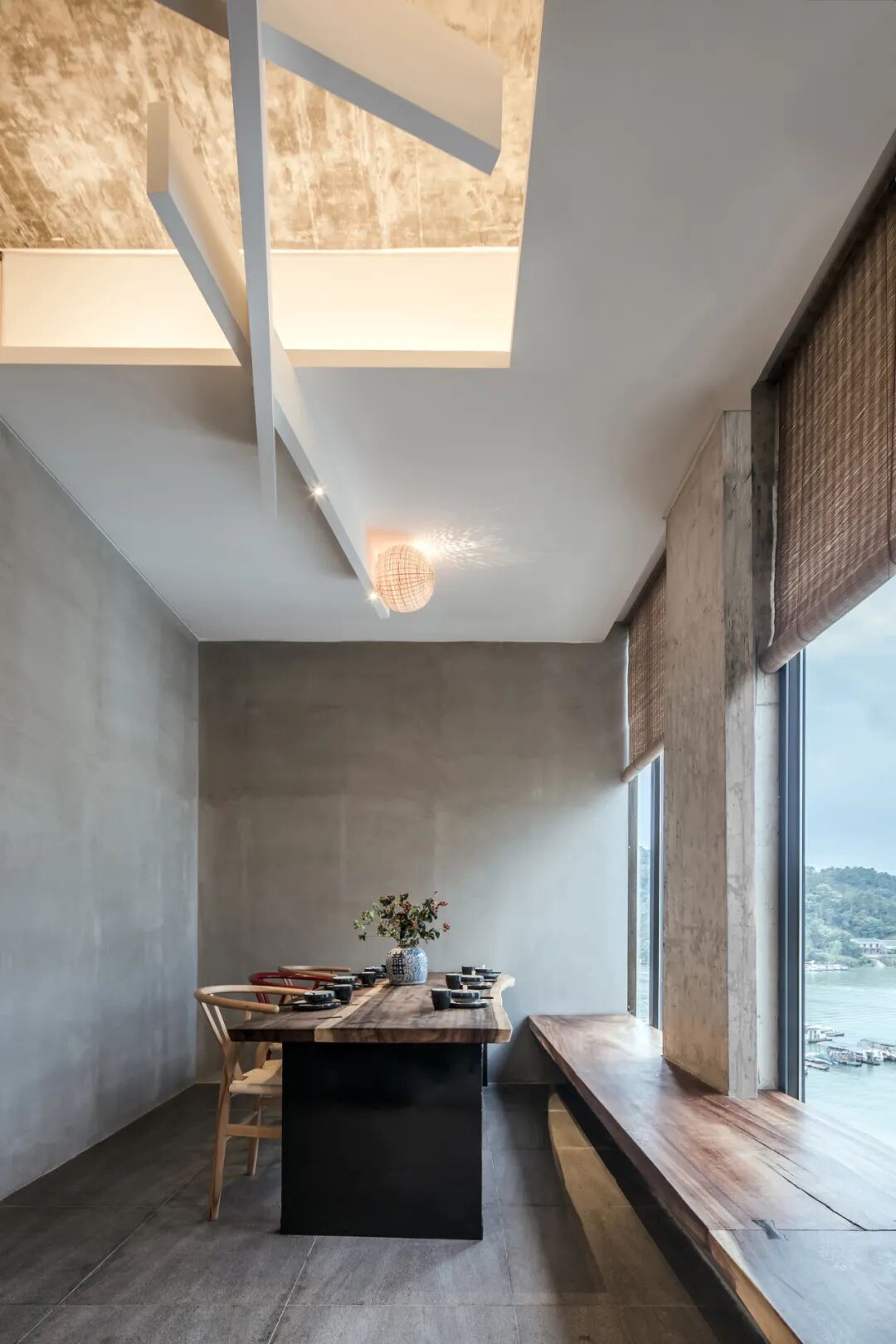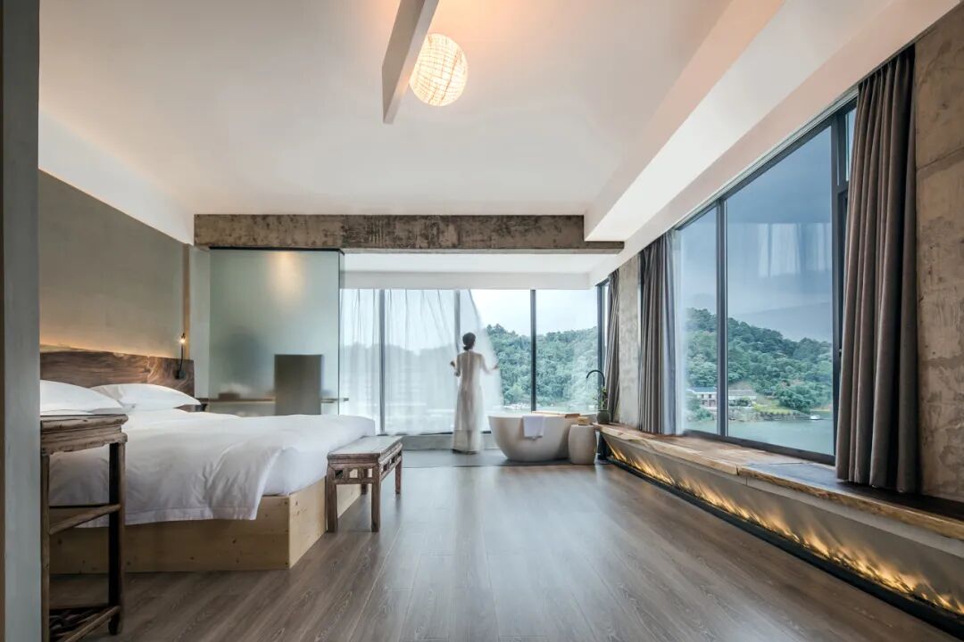 民宿的房间设计更多的考量了与万绿湖的互动关系,在原有建筑格局当中,尽可能的使用了透明的光面玻璃,创造了看湖的条件。巨幅透明光亮玻璃的使用确保了看湖风景完整性的同时,也丰富了建筑面和自然的过渡,形成“框景”的效果。