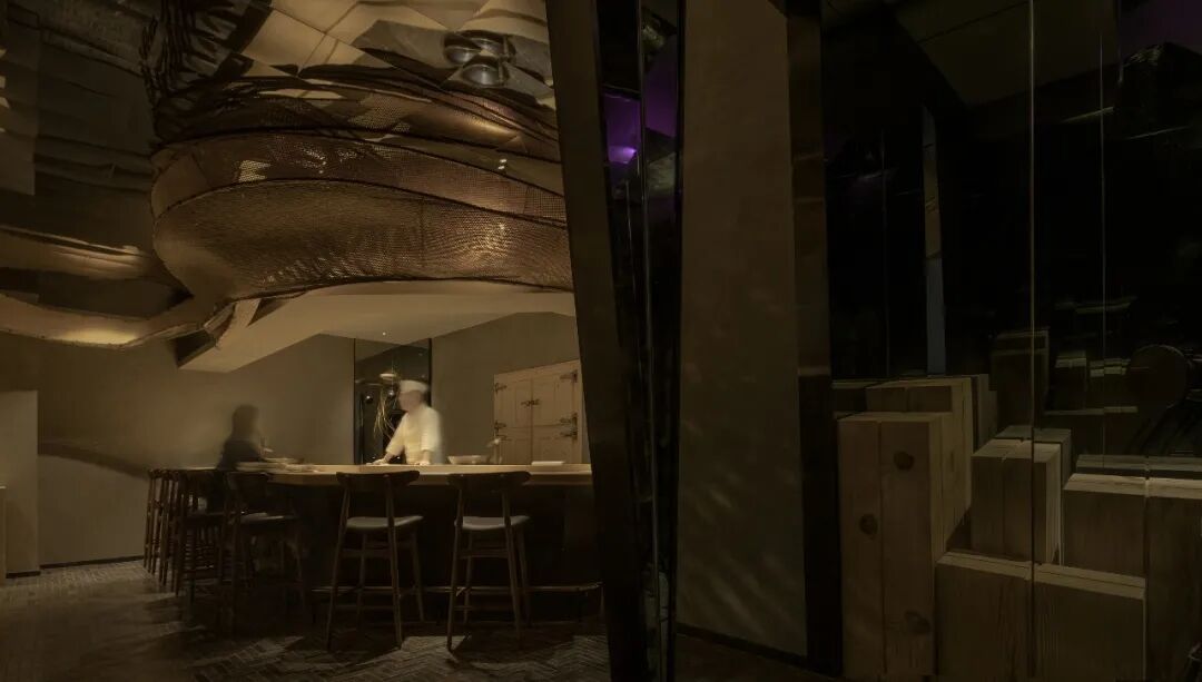咖色实木桌椅打破沉闷,与顶部设计巧妙的竹装置呼应在富有层次感的灯光效果中,使人能够更加沉浸于美食与环境的轻松与愉悦之余目光更集聚于光源的聚焦点:Omakase日料大师的手作过程,巧手翻覆间佳肴天成。