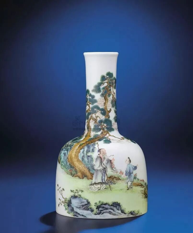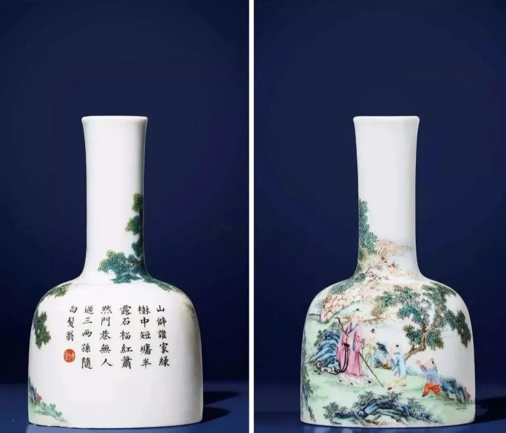 与此画珐琅摇铃尊风格相近者仅数例,或出现于拍场以善价售罄,或蒐藏于展馆得大众瞻仰。有两件相同题材配诗文珐琅彩摇铃尊,其一为尧山观景图画片,另一为“寻隐者不遇”图案。