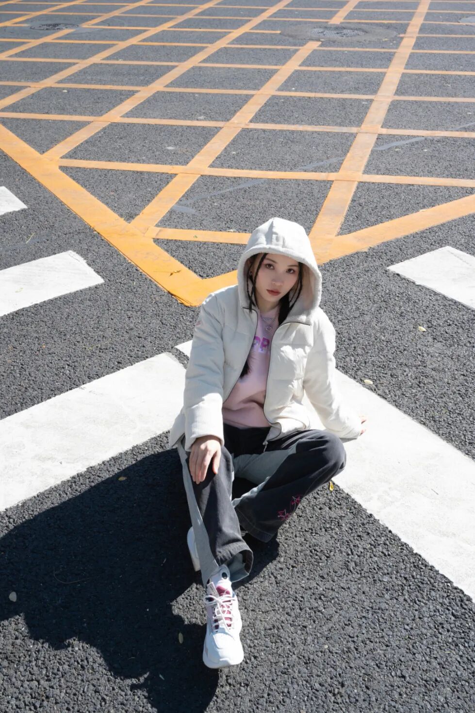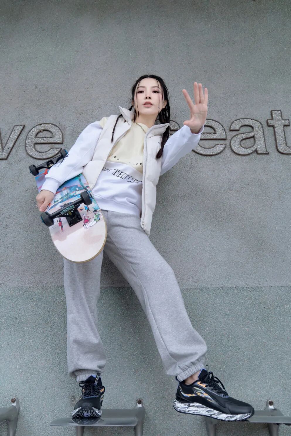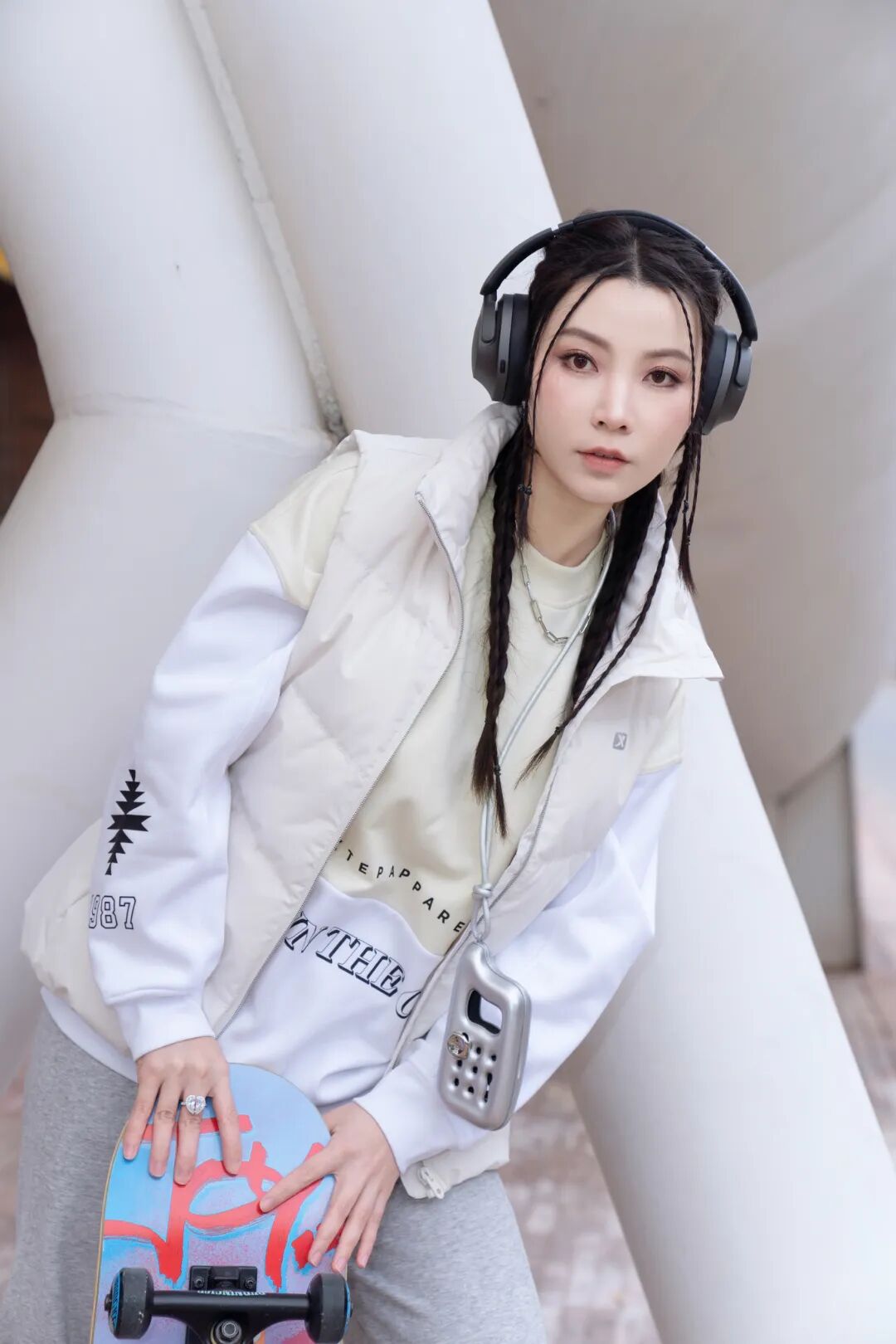滑滑板的时候,我喜欢卫衣+羽绒马甲的穿搭组合。