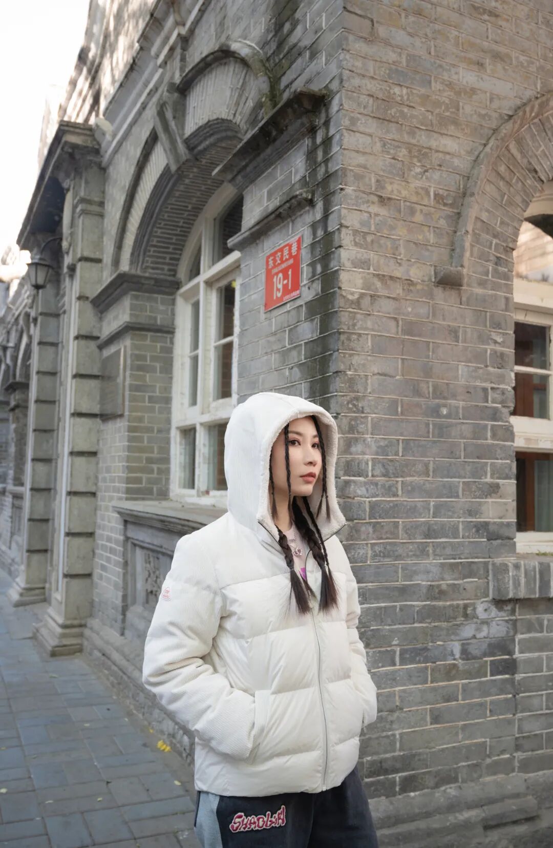 灯芯绒羽绒服和牛仔运动裤,远看是很有设计感的运动风,近看竟然是灯芯绒配牛仔。