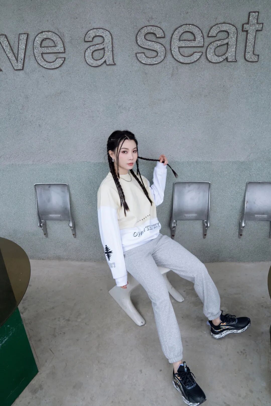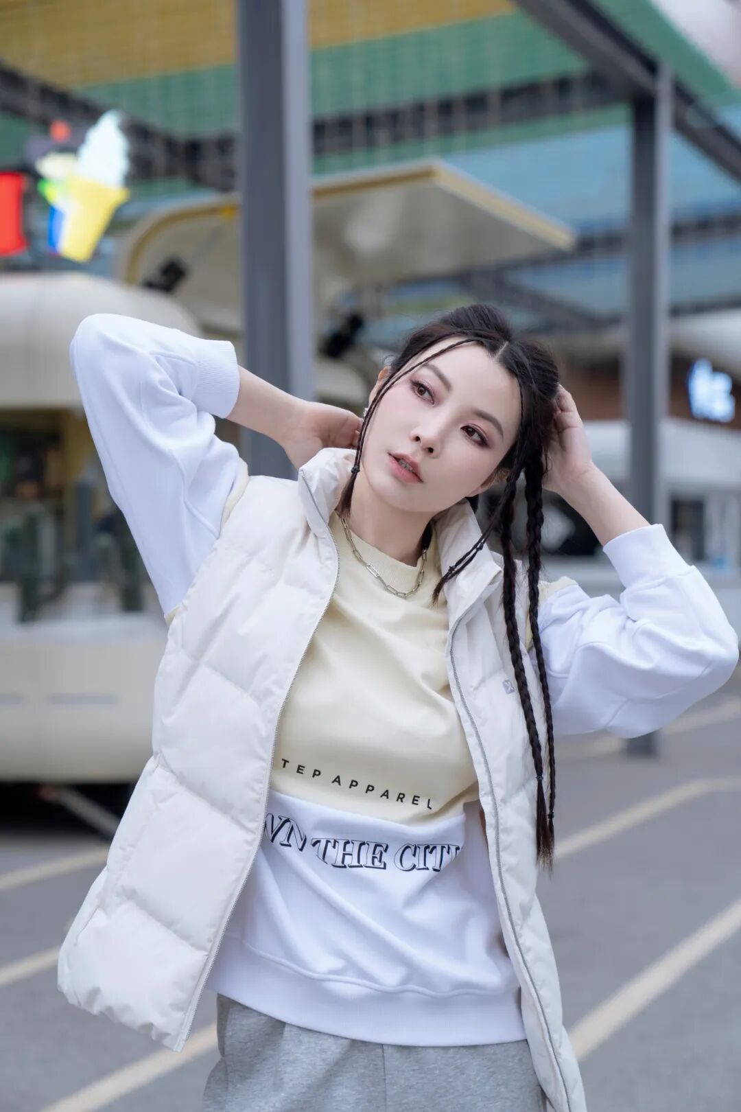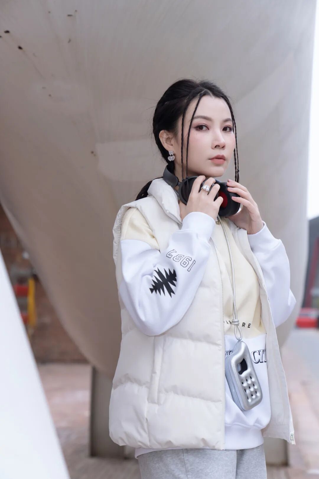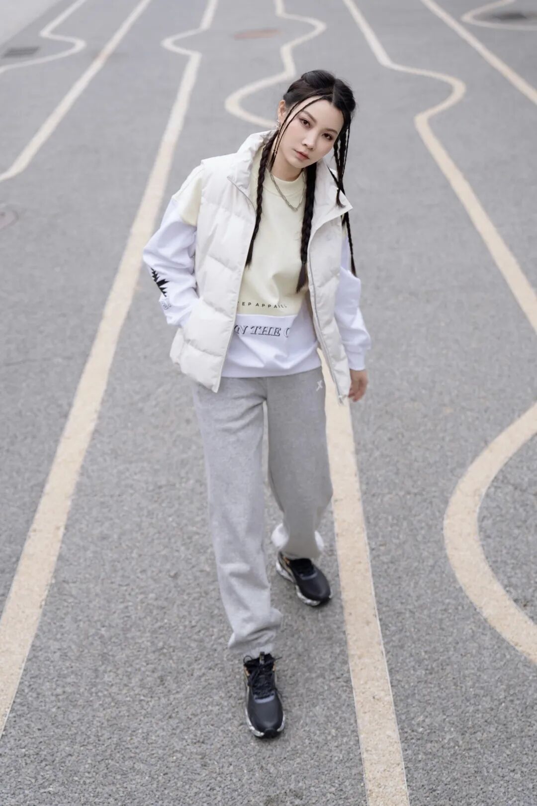 搭配灰色卫裤,都是低饱和色系,甜酷皆可。马甲卫衣,时髦保暖同时不影响运动时做动作。