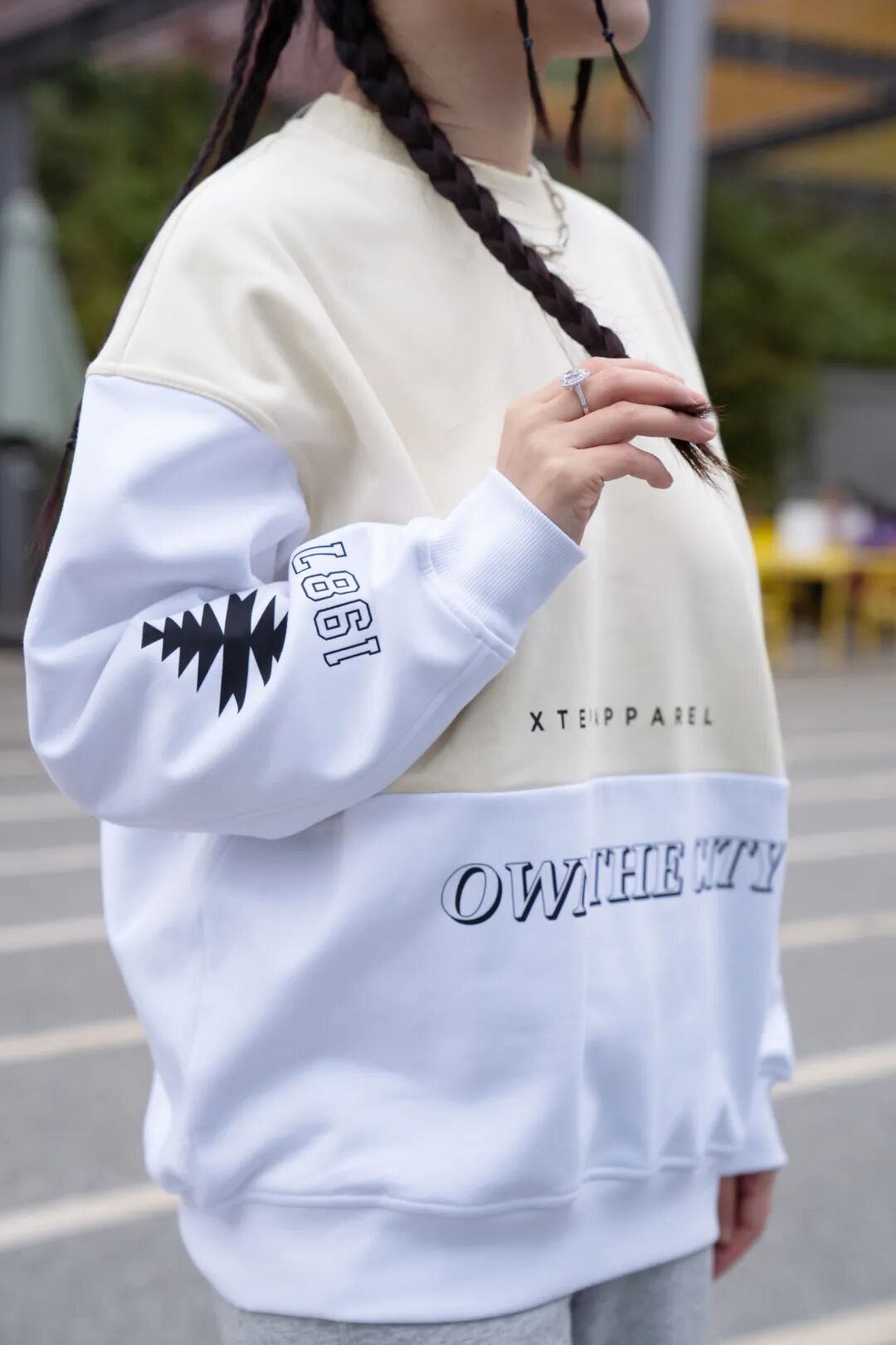 搭配的卫衣也是奶黄色的,有点像半熟芝士的色调,落肩的设计完美修饰肩膀,拜拜肉消失,对窄肩女孩友好。