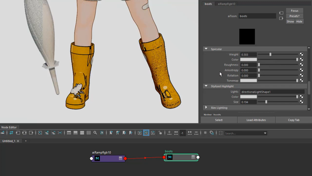 然后我们来做鞋子部分的材质,同样的我们为鞋子分配一个aiToon材质球,也创建一个aiRampRgb并连接到Base_Tonemap,然后在Ramp中为鞋子调整一个合适的颜色,然后将鞋子的线框颜色设置为深棕色,将Angle_Threshold数值降低,让鞋子上细节更清晰。