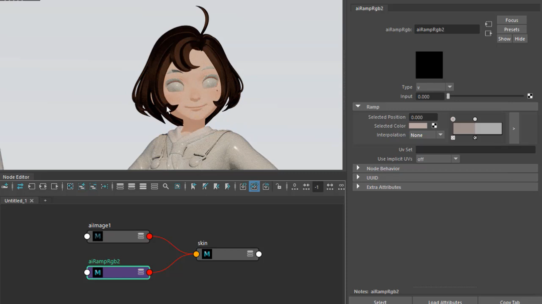 同样的创建一个aiRampRgb,把它连接到皮肤材质球的Base_Tonemap,将Ramp下的插值(Interpolation)设置为无(None),然后调整选定位置(Selected Position)和选择颜色(Selected Color),使皮肤呈现出正常的肤色。