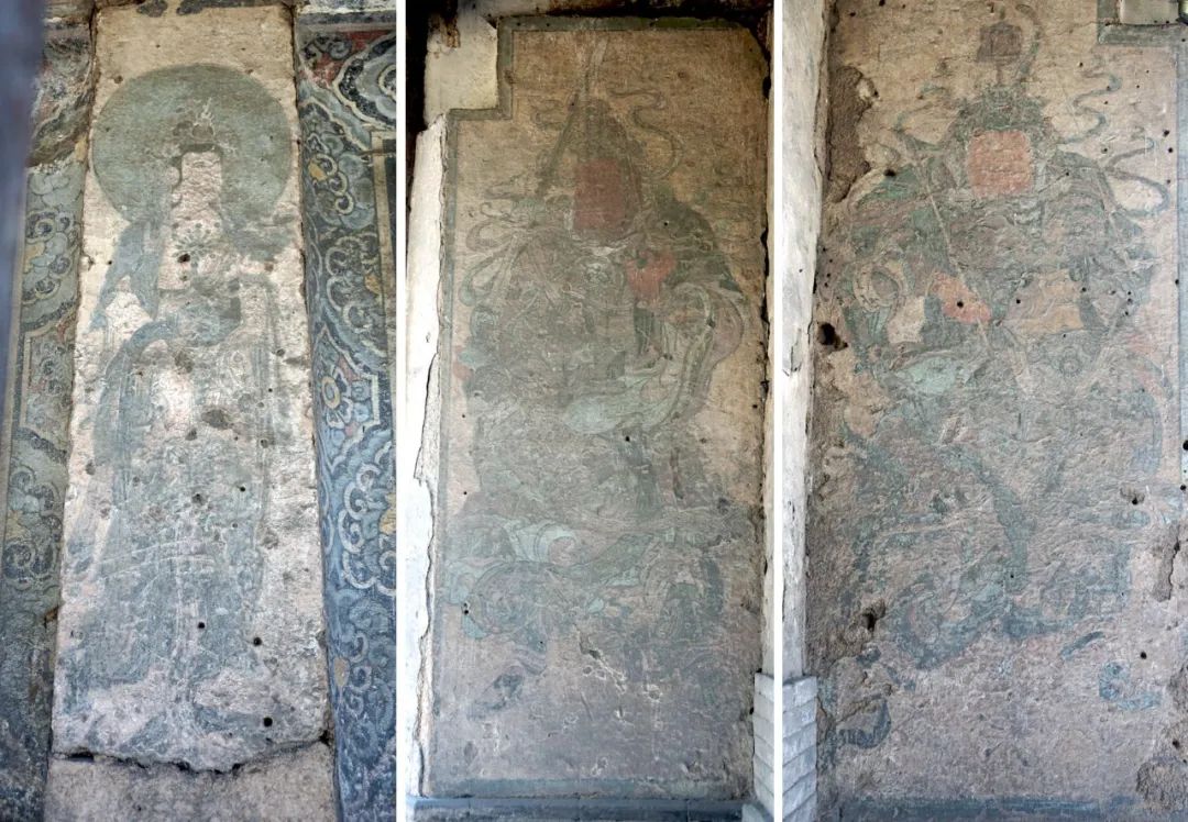 天王殿内,天冠弥勒菩萨居中而坐,帝释、梵天胁侍左右。南墙东西两旁供四大天王像;北墙供八大菩萨。