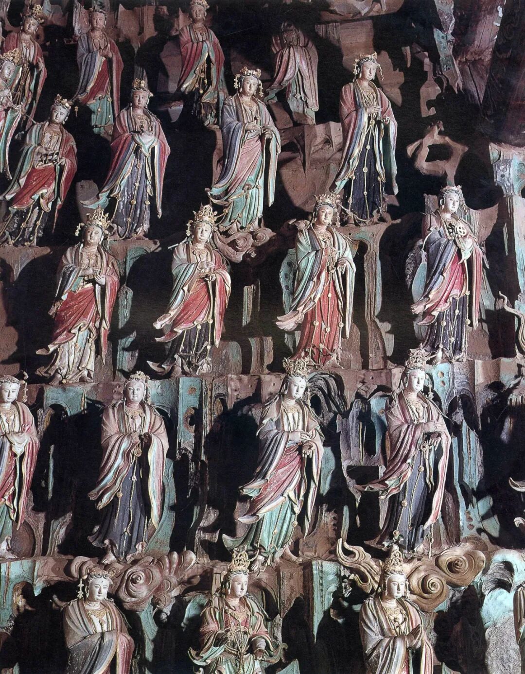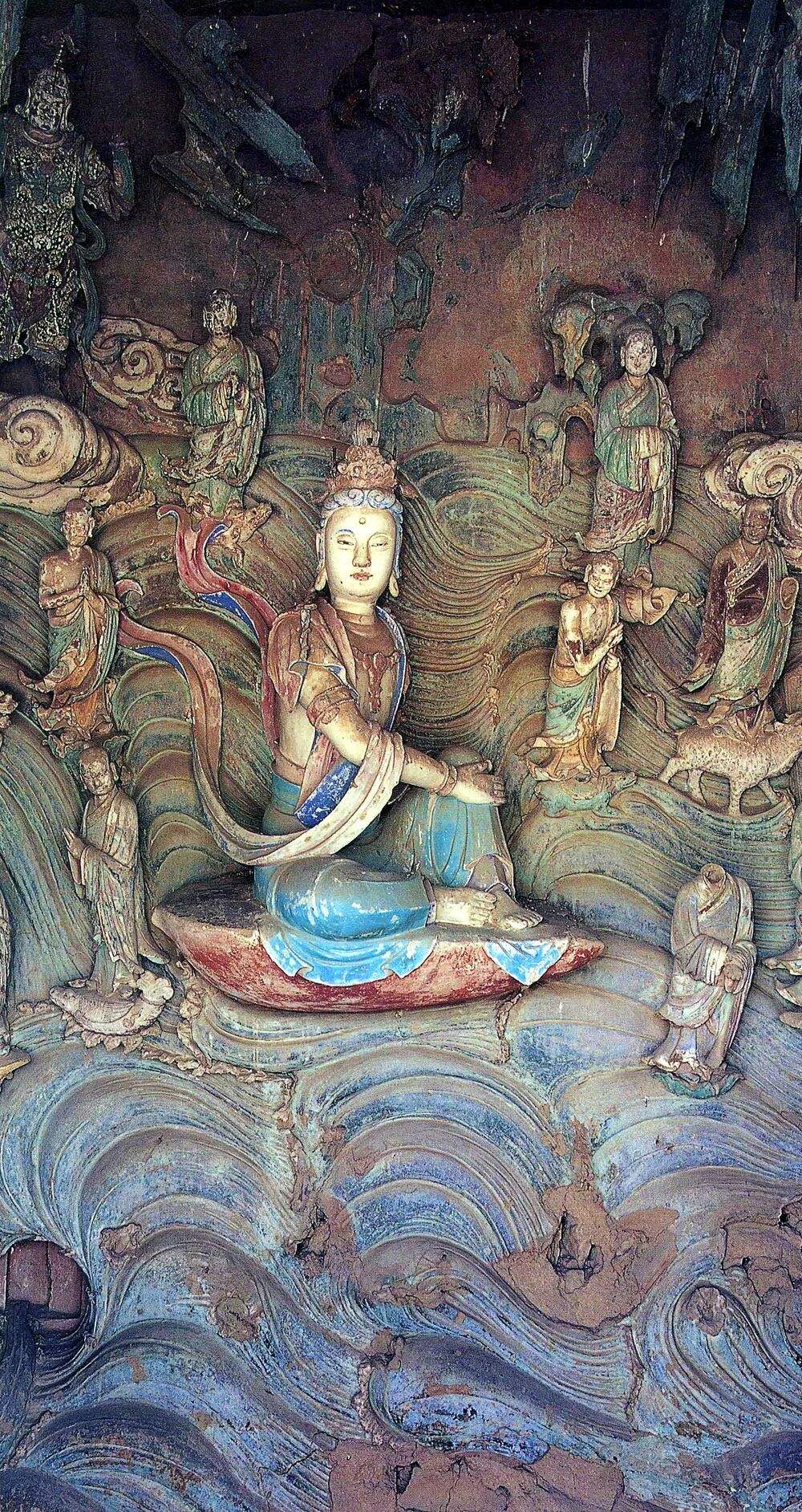 千佛殿内四周为壁塑五百菩萨,高0.69—0.82米。分为五至六层,或驾祥云,或骑异兽,与主像联系照应,浑然一体,造型写实逼真。更有观世音菩萨救众生苦难之故事,分置于二至六层崖石上,现存塑像有四百七十多尊,均朝向观自在菩萨。