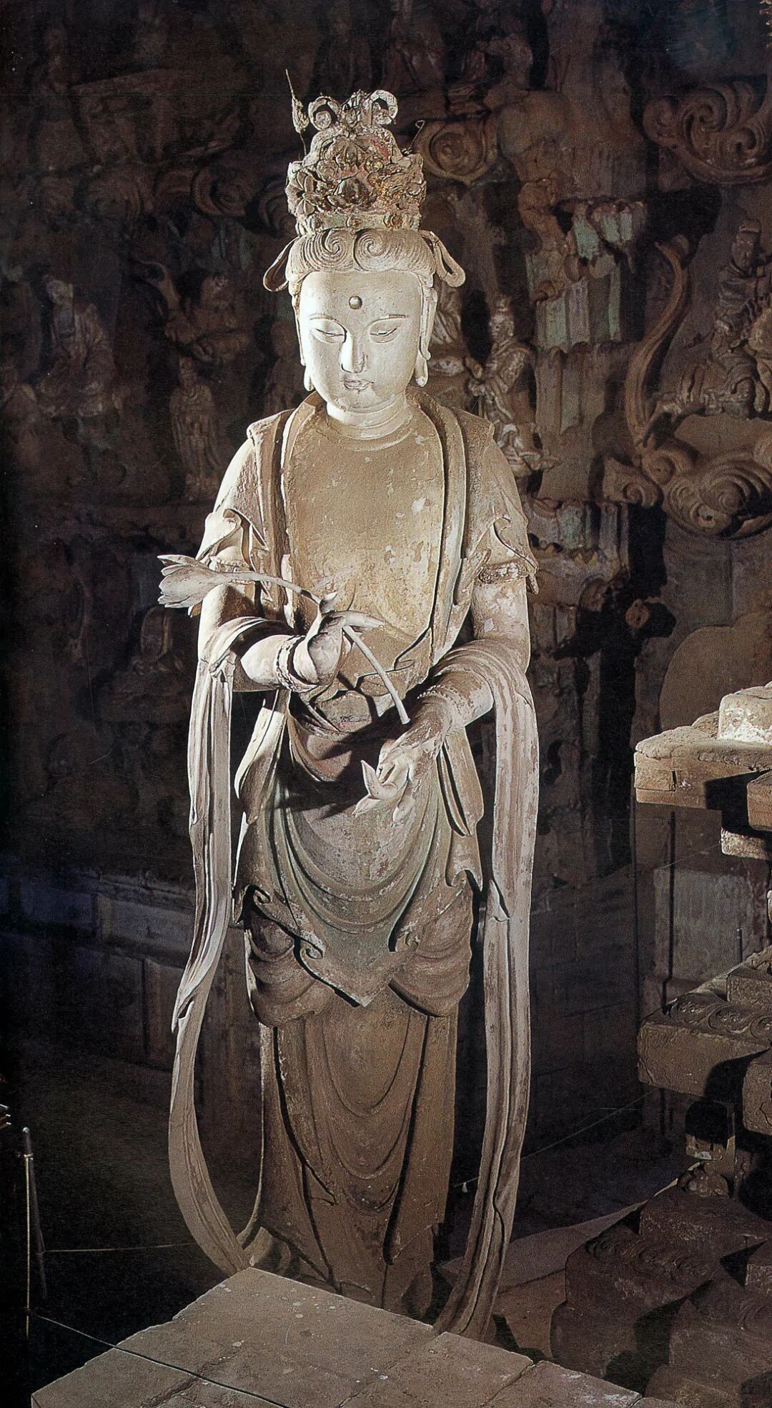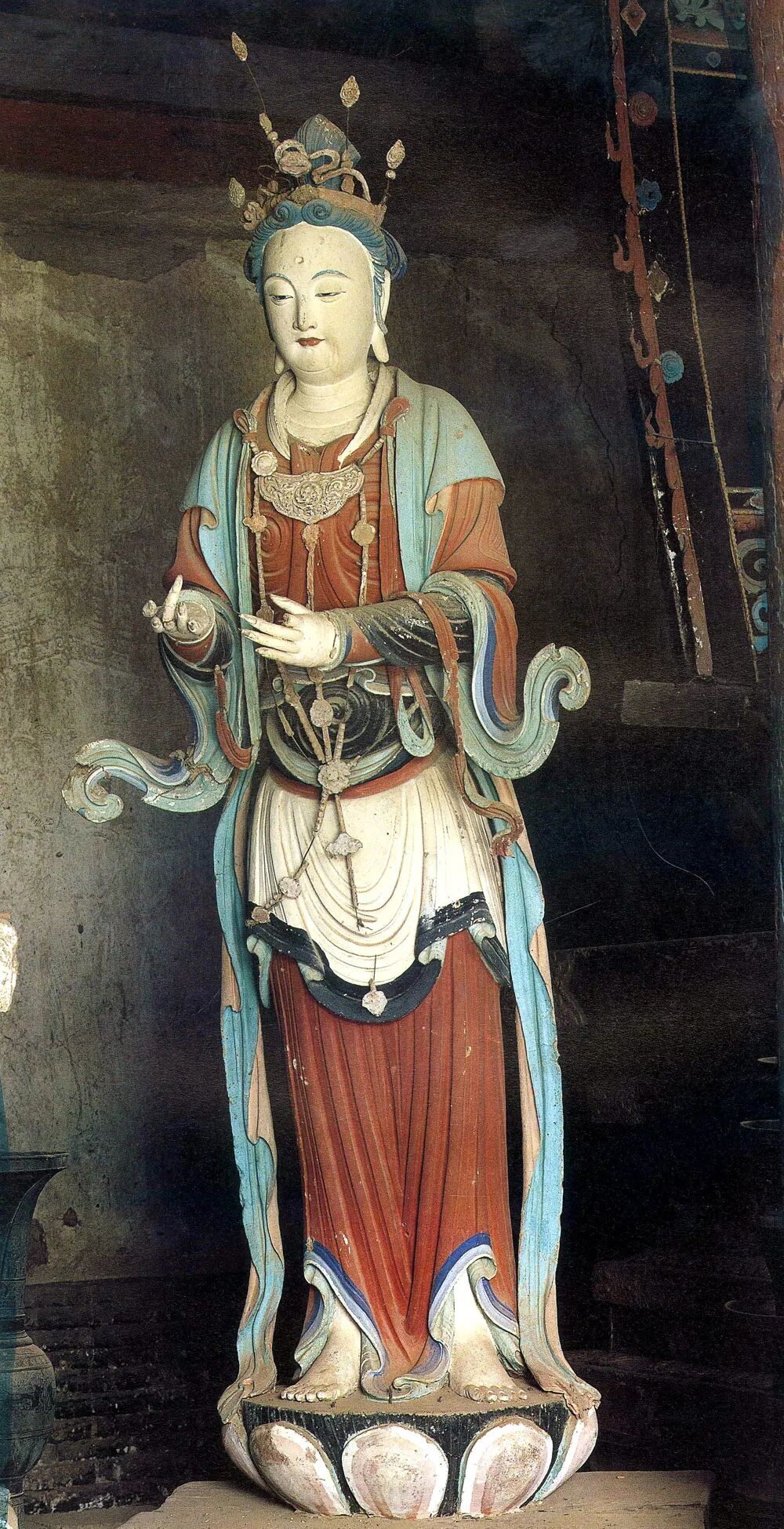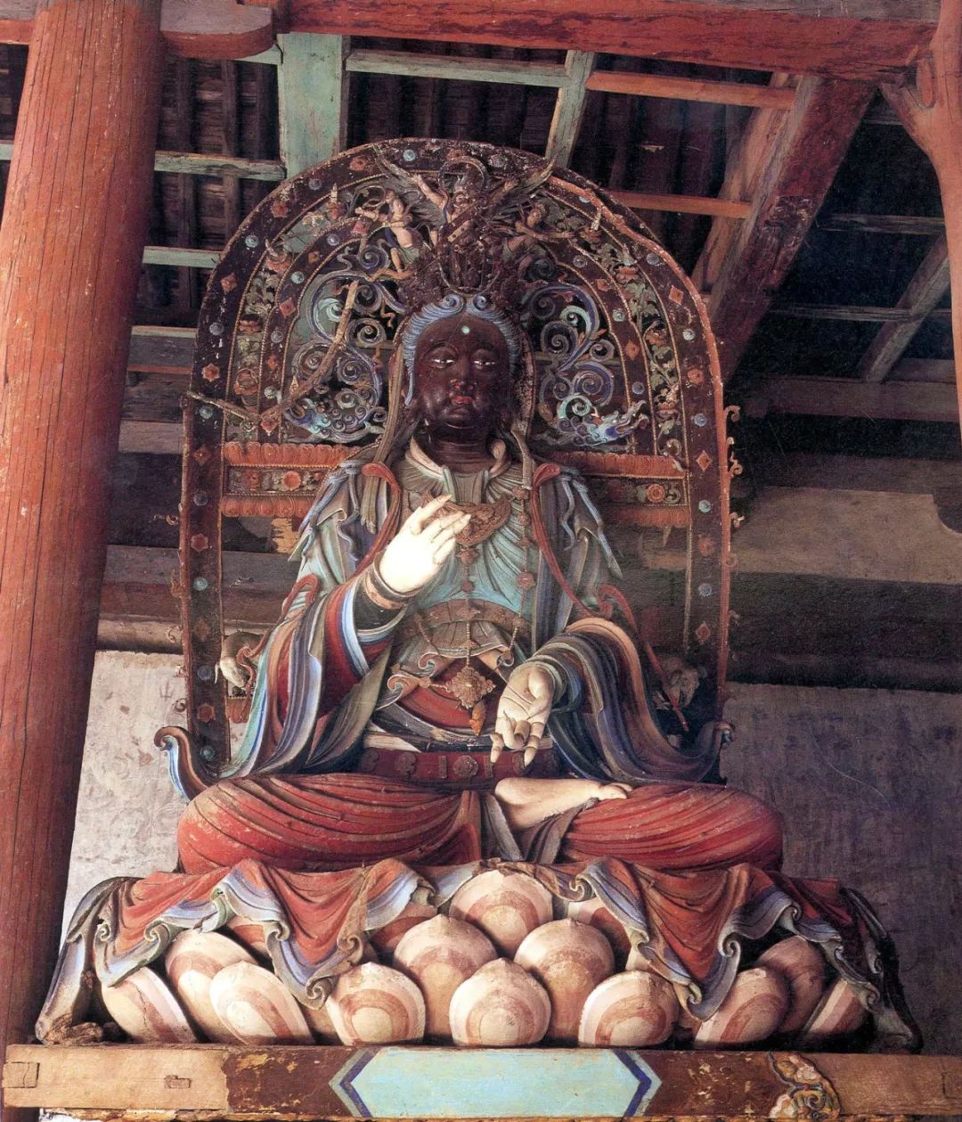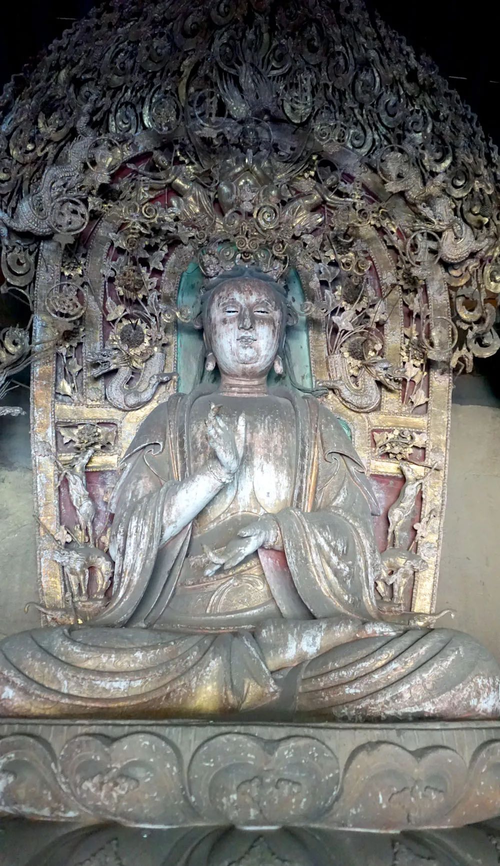 释迦殿主尊背壁后为一叶观音,高广3.4米,观世音菩萨为摄化众生而自在示现三十三种妙相,第十三种形象即为一叶观音,观音用圆雕手法塑造,单腿盘坐,衣带飘扬,乘一叶红色莲瓣于波涛上,神情安详自若,与波涛汹涌的海浪形成静与动的强烈对比。四周塑罗汉各踏兽座、莲座,有护持菩萨,寻声救苦,普度众生,脱离苦海;更有韦驮天将乘云而来。菩萨两旁梁下,有三层石台,各有骑兽六臂明王五尊,下有力士托脚,另有胁侍六尊。