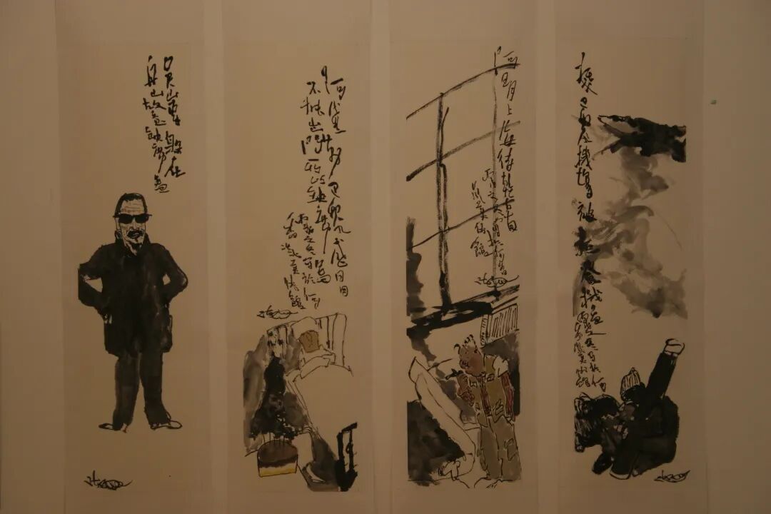 其中我邀请的参展有四位艺术家,虽然他们的作品在场地中展出,但是艺术家本人有各种原因现场缺席,所以艺术家陈侗在现场搭建的工作室中创作。他在展厅里即席画出四位参展艺术家的故事,用水墨作品《缺席四条屏》介绍为什么艺术家不能到现场。