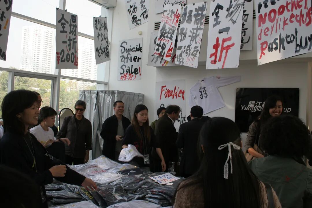 阳江组(郑国谷、陈再炎、孙庆麟)在美术馆的入口做了个卖衣服的商店,作品题目《最后一日,最后一搏》。当时阳江和深圳各地很多小商店由于各种原因倒闭,阳江组把“倒闭的小商店”作为符号,引到美术馆里表达当下的社会关注,通过民间的书写形式和买卖表达与社会有关的问题,连接着艺术和日常生活。
