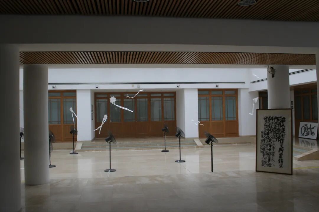 在展览入口的天井,九台风扇制造的微风吹动着九只风筝,是陈劭雄和小泽刚的作品《广州—东京II》,由风车、电风扇和风筝组成的装置作品,陈劭雄和小泽刚通过邮政快递彼此交换水墨作品,从而保持了一种远距离的艺术对话。我在作品旁边放置了像题跋一样的书法,邀请哲人和艺术家写下他们关于展览题目的想法。