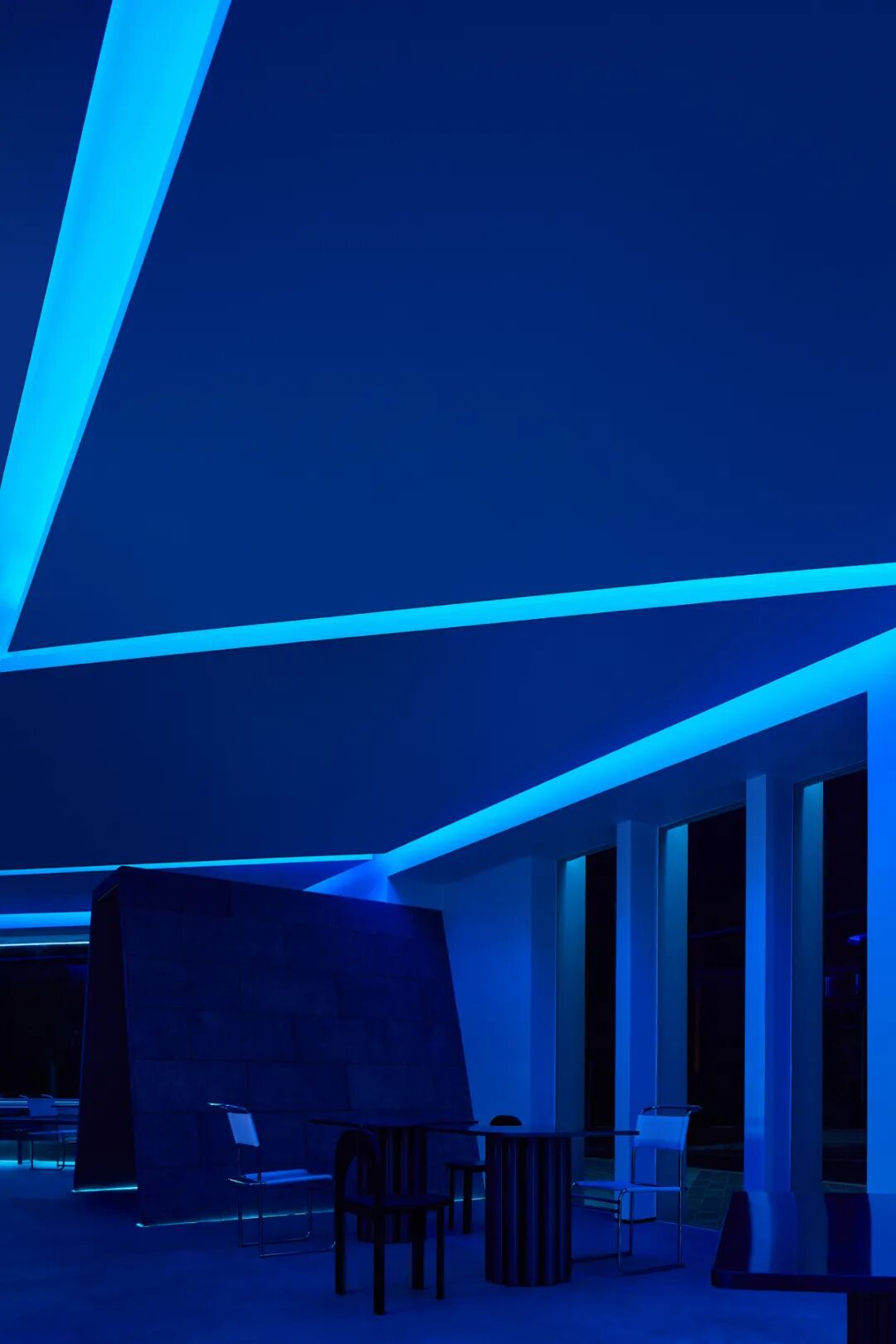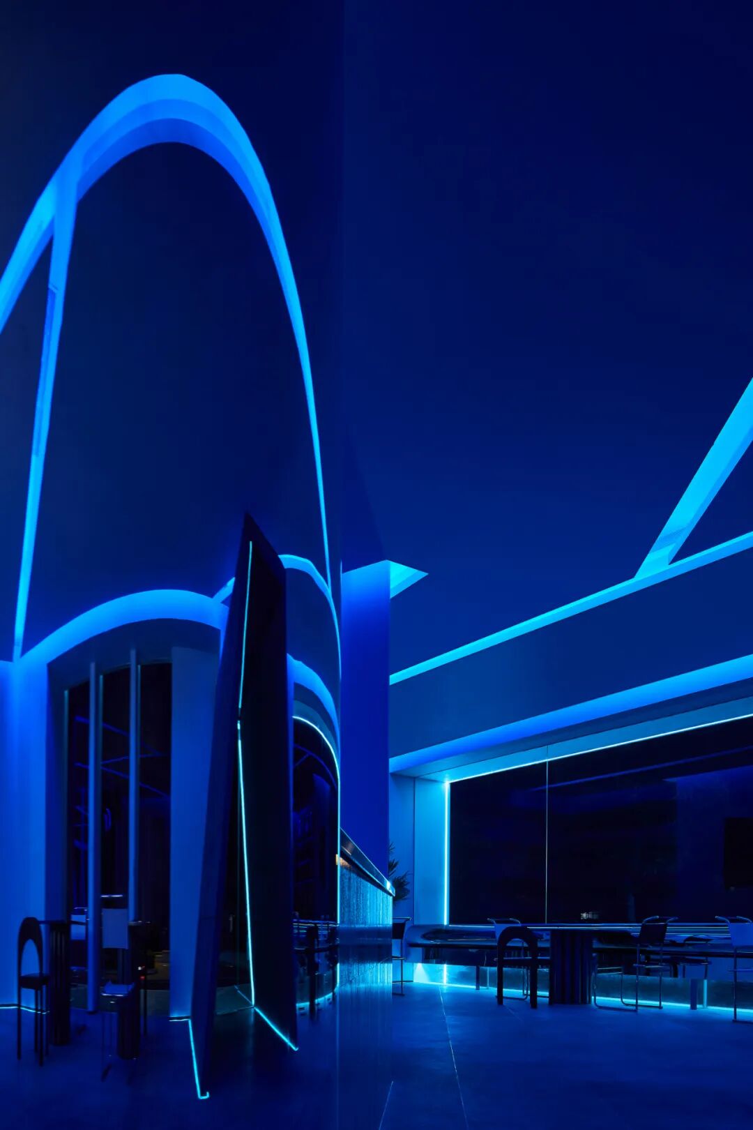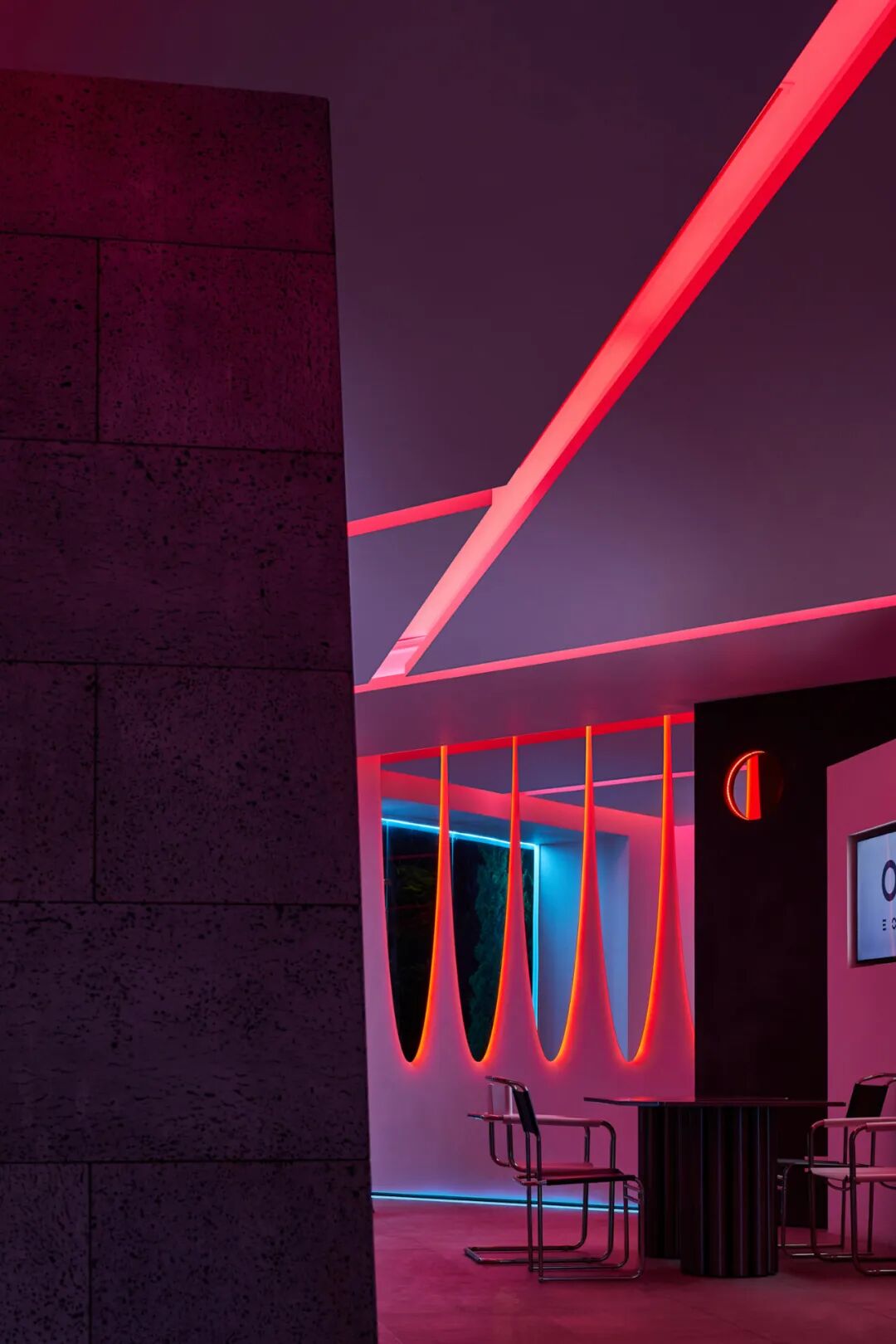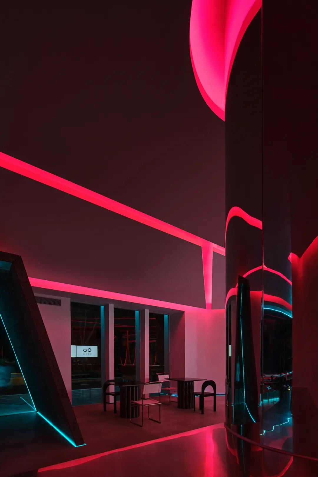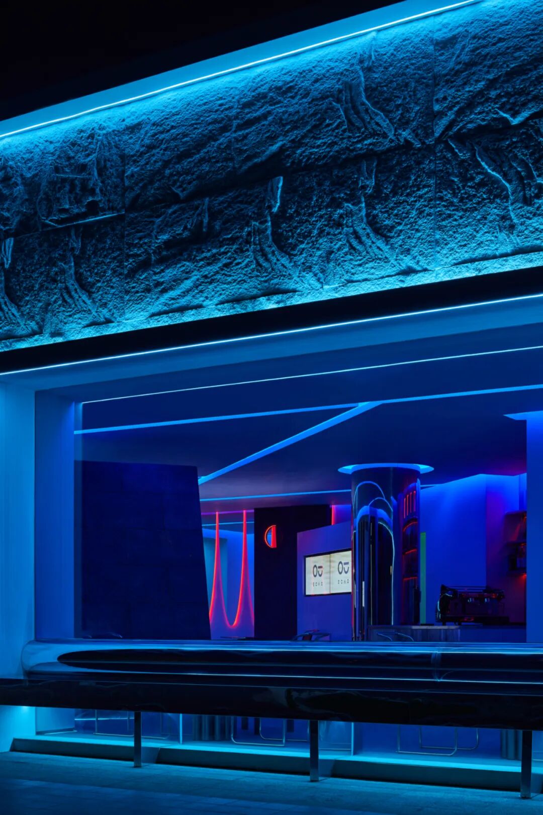而到了夜晚,灯光的置入成为空间的另一种情绪,渲染出朋克的未来科技感。线型灯围合出的入口结合幽深的隧道仿佛通往未知的神秘领域;不锈钢、玻璃、镜面、混凝土等材质在灯光的映照下呈现与白日截然不同的、璀璨夺目的变幻光影。感官被周遭的光线、色彩、材质、声音所唤醒,进入一场沉浸式的、关于异度空间的想象之中。