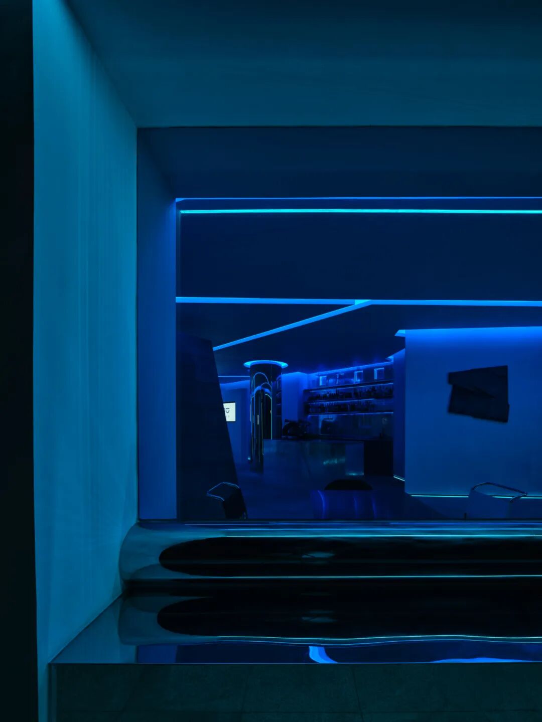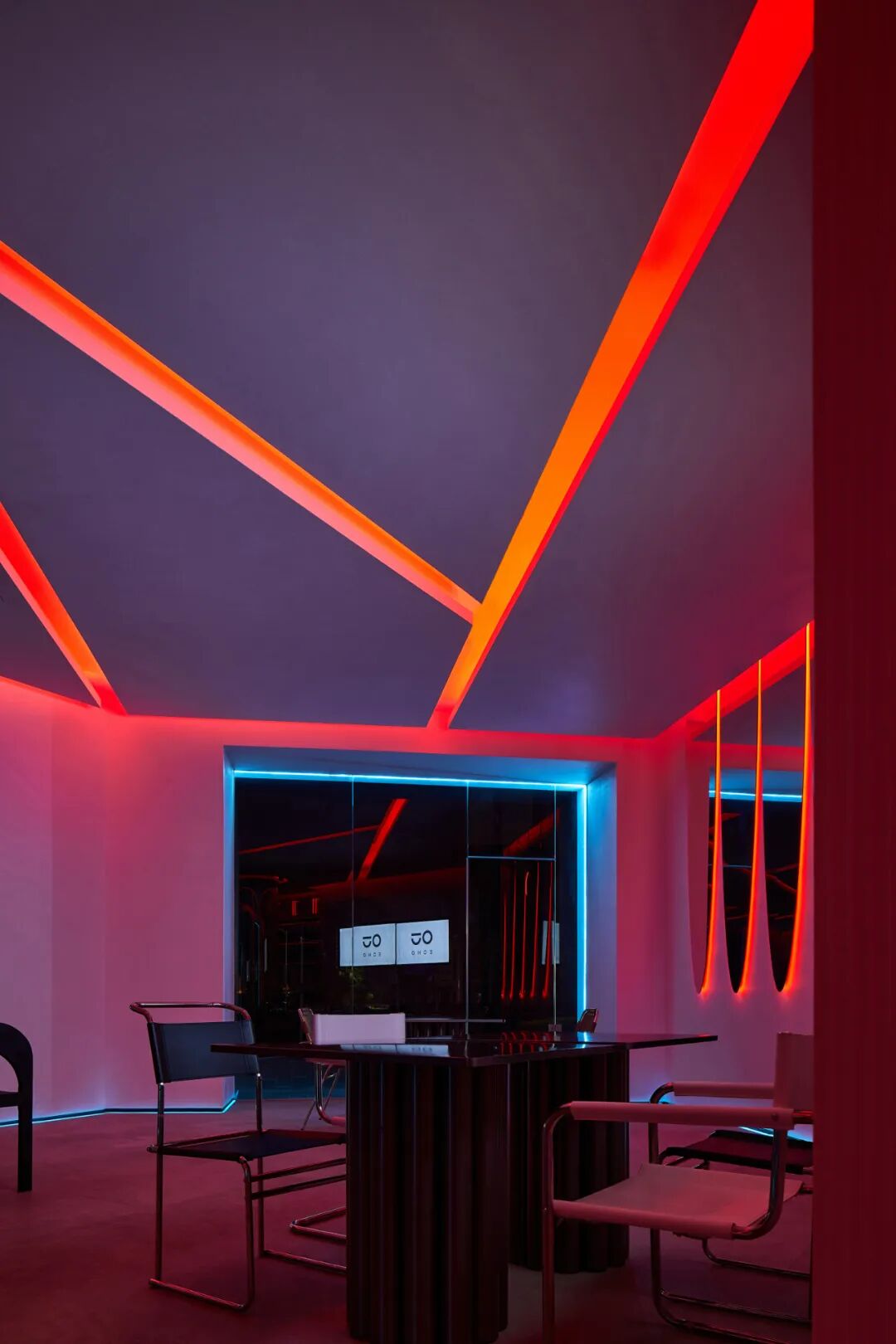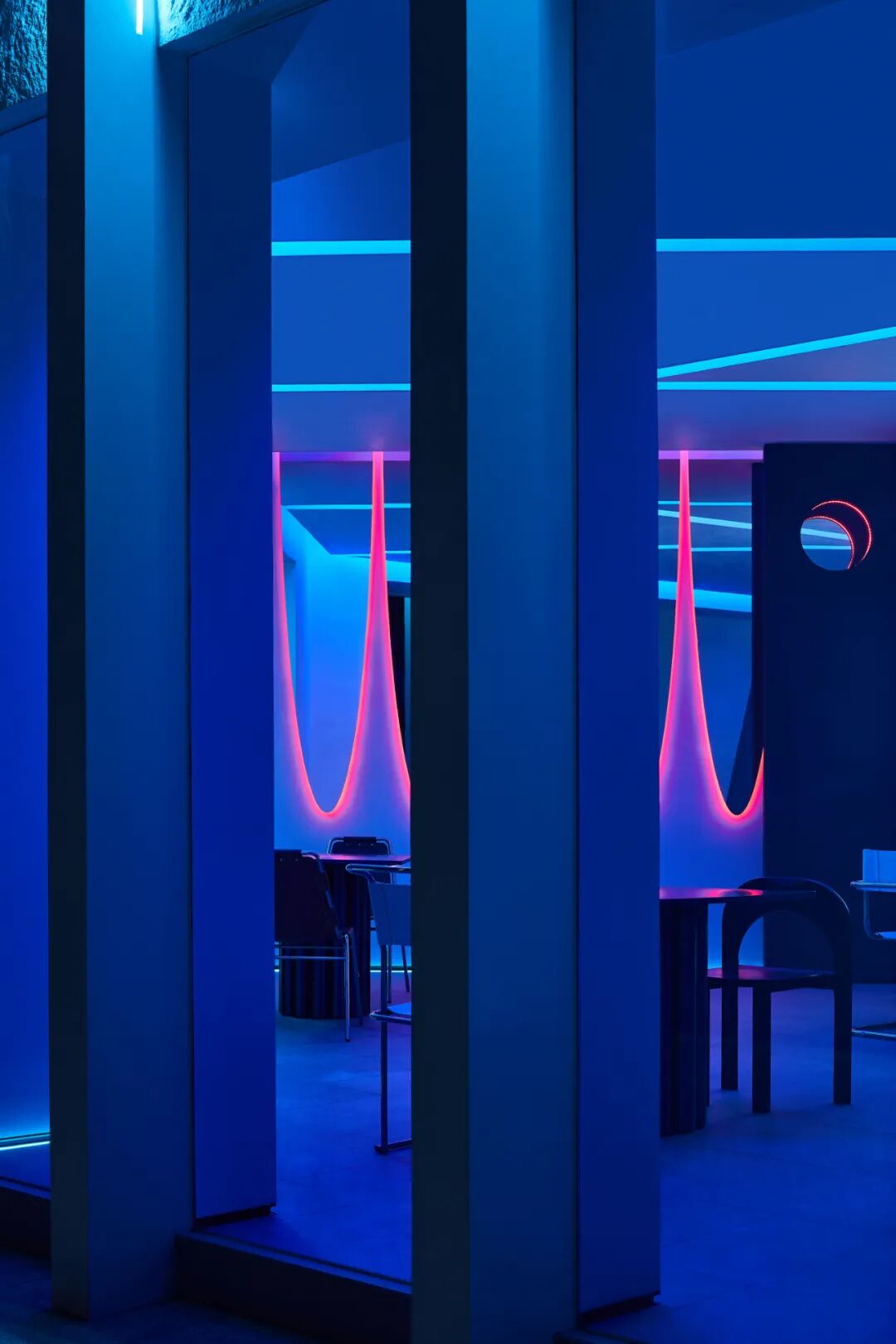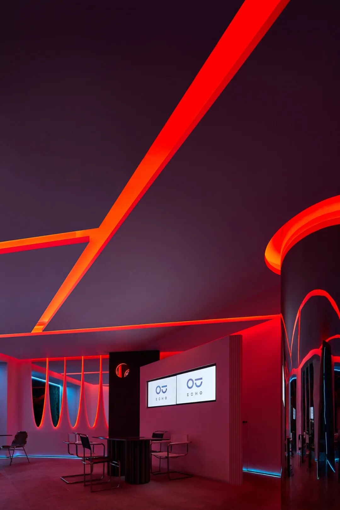 而到了夜晚,灯光的置入成为空间的另一种情绪,渲染出朋克的未来科技感。线型灯围合出的入口结合幽深的隧道仿佛通往未知的神秘领域;不锈钢、玻璃、镜面、混凝土等材质在灯光的映照下呈现与白日截然不同的、璀璨夺目的变幻光影。感官被周遭的光线、色彩、材质、声音所唤醒,进入一场沉浸式的、关于异度空间的想象之中。