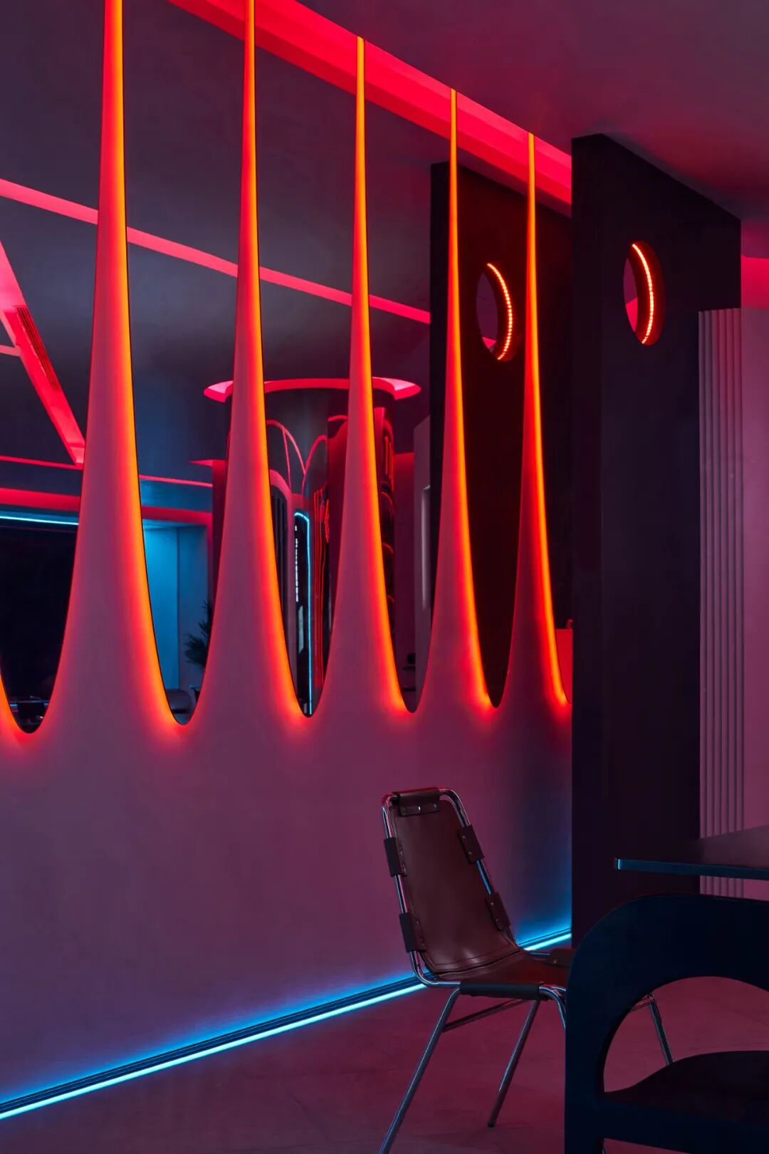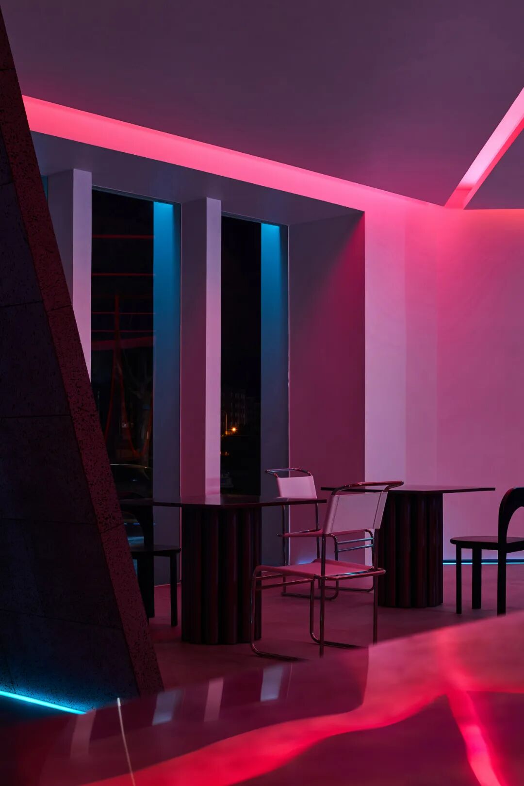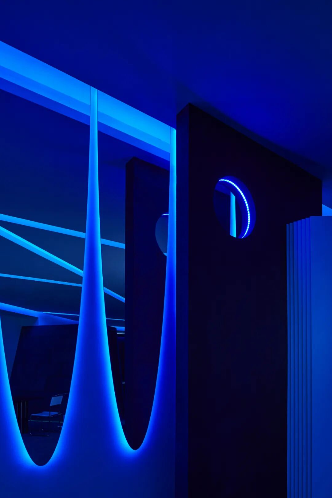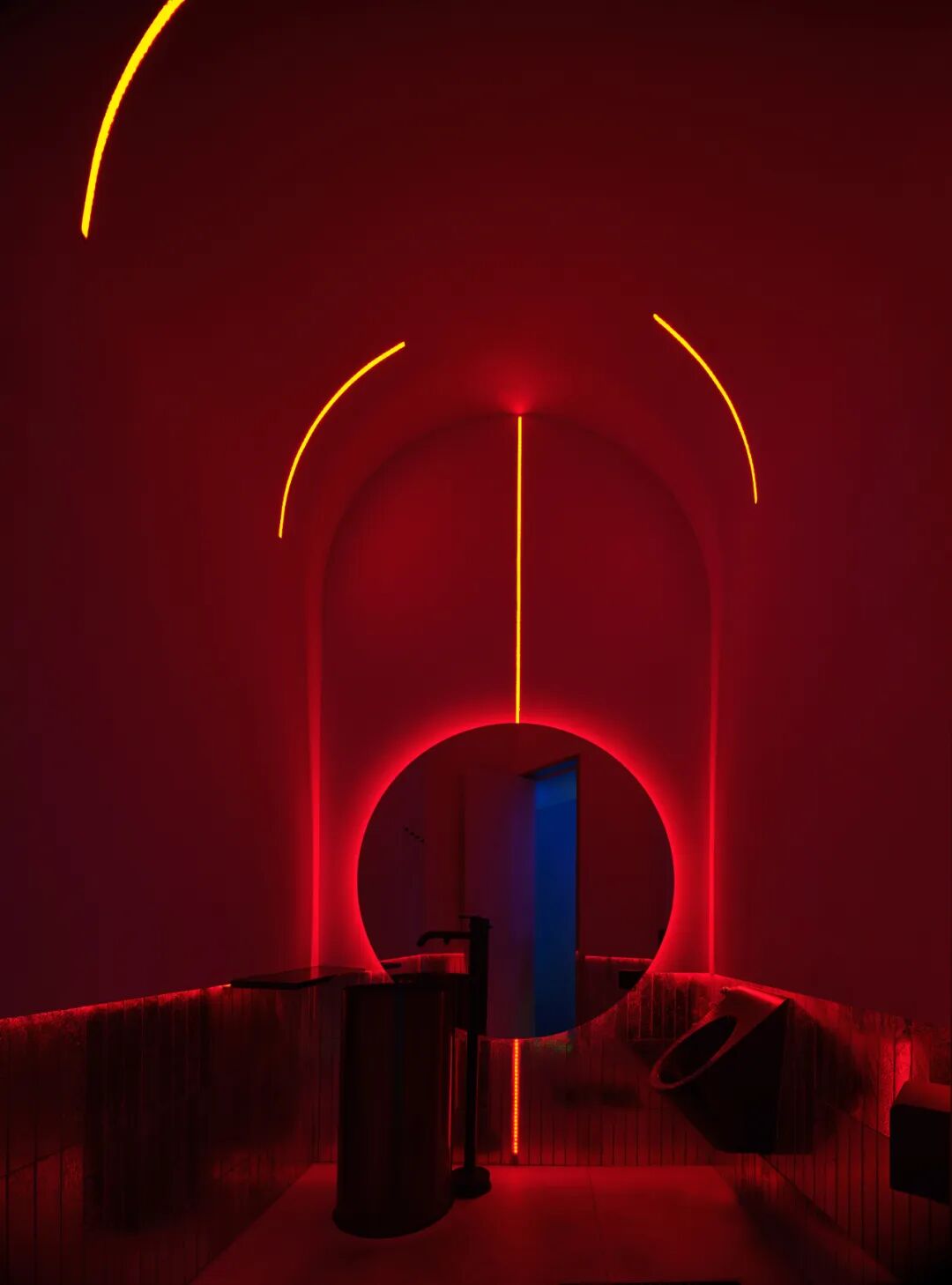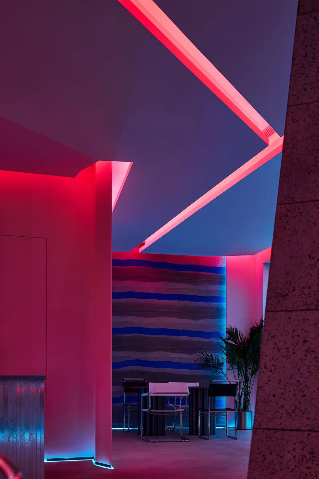 而到了夜晚,灯光的置入成为空间的另一种情绪,渲染出朋克的未来科技感。线型灯围合出的入口结合幽深的隧道仿佛通往未知的神秘领域;不锈钢、玻璃、镜面、混凝土等材质在灯光的映照下呈现与白日截然不同的、璀璨夺目的变幻光影。感官被周遭的光线、色彩、材质、声音所唤醒,进入一场沉浸式的、关于异度空间的想象之中。