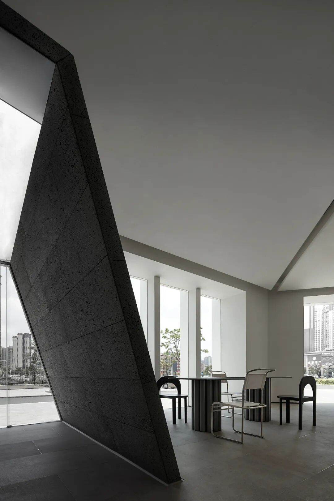 双羽设计希望借由抽象几何的空间塑造,打造一种关于就餐场所的仪式感和科幻感,激发顾客对于自然与美食的美好联想;通过材质的组合与碰撞,自然光与人造光线呈现的反差与想象,建构出一个关于白天与夜晚,情绪与感官、自然与科技、当下与未来的双重都市幻想。
