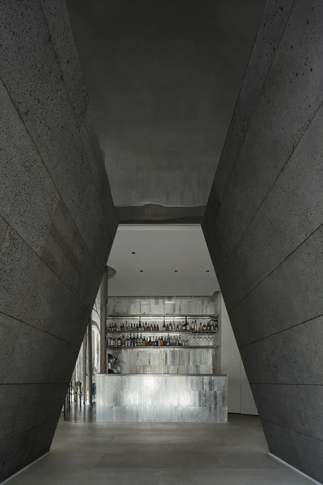 于入口处,置入一个梯形的过渡形体,创造出由外而内的时光隧道之旅。穿过玻璃门,视线被火山岩丰富细腻的肌理表情所吸引,从外部的喧闹到达独具特色的内部空间,顾客的情绪也产生了微妙地转换。视线端点,闪烁着金属光泽的吧台与地面融为一体,一侧的亮面不锈钢圆柱,映射了周围的复杂环境,营造出后现代式简约冷峻的空间情境。