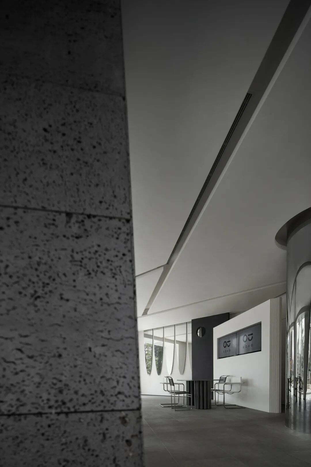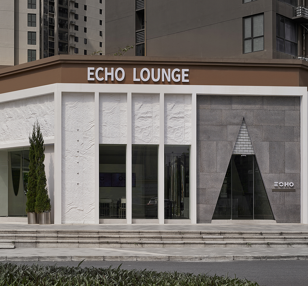 数学几何是自然的简约方式,也是自然的复杂逻辑。ECHO LOUNGE独特的几何形入口、外立面粗粝的自然浮雕肌理和大尺度的落地窗结构,于周围的裙楼建筑中凸显出来。与之相对应的,色彩的深与浅、几何的面与线,材质的纯粹性和肌理表情却创造了一种戏剧性的视觉对比。