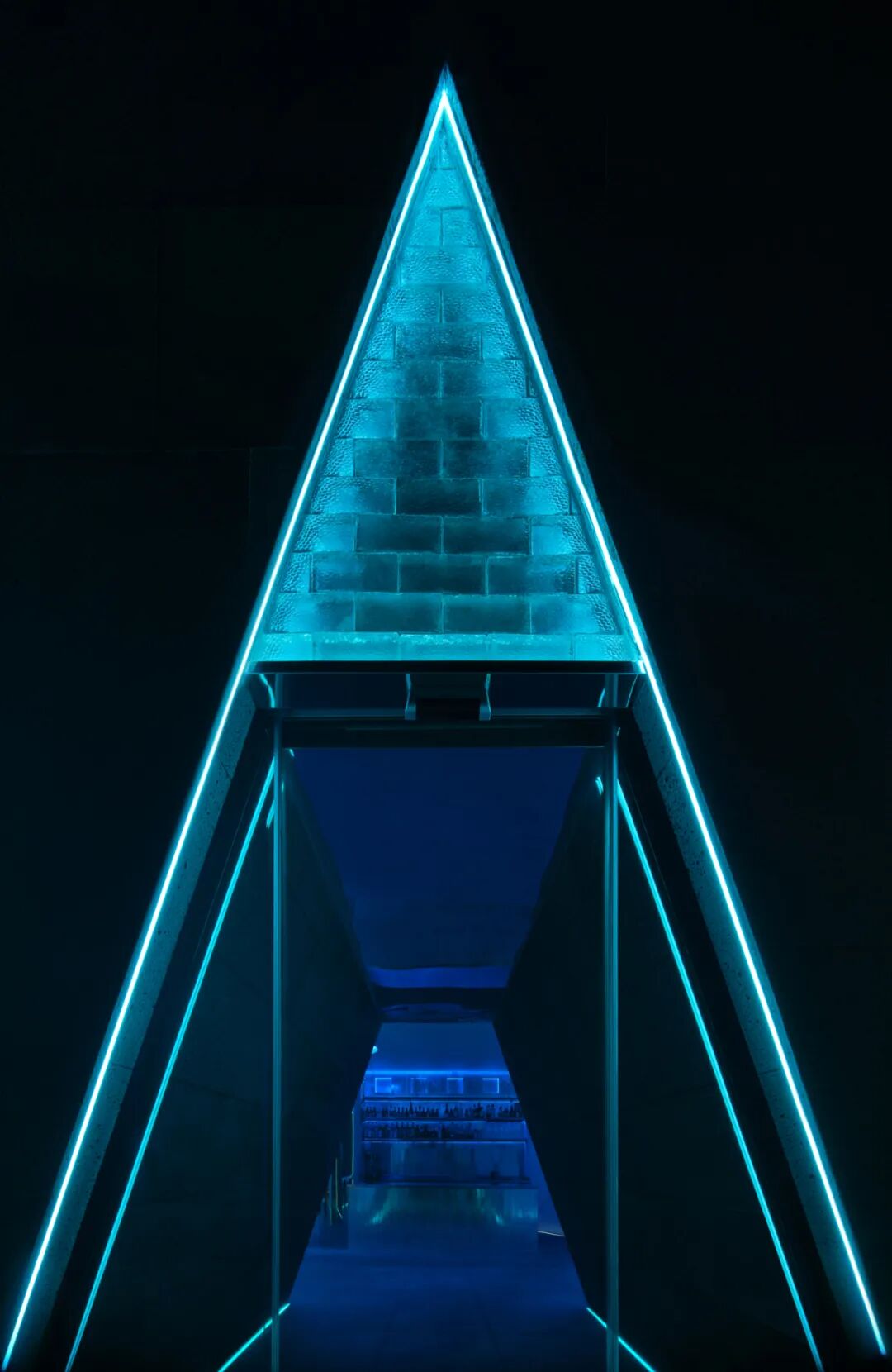 三角形作为个性鲜明的符号,向来传达出独特的神秘感。方向性的几何线条塑造出ECHO LOUNGE的主要入口,内嵌在区别于其他立面的深色墙面之中,使整个不规则的场地单独出现了稳定的轴线结构,并形成了一定的视线遮挡,暗示着未知情节的即将发生,吸引顾客的好奇、停留,继而步入室内,一探究竟。