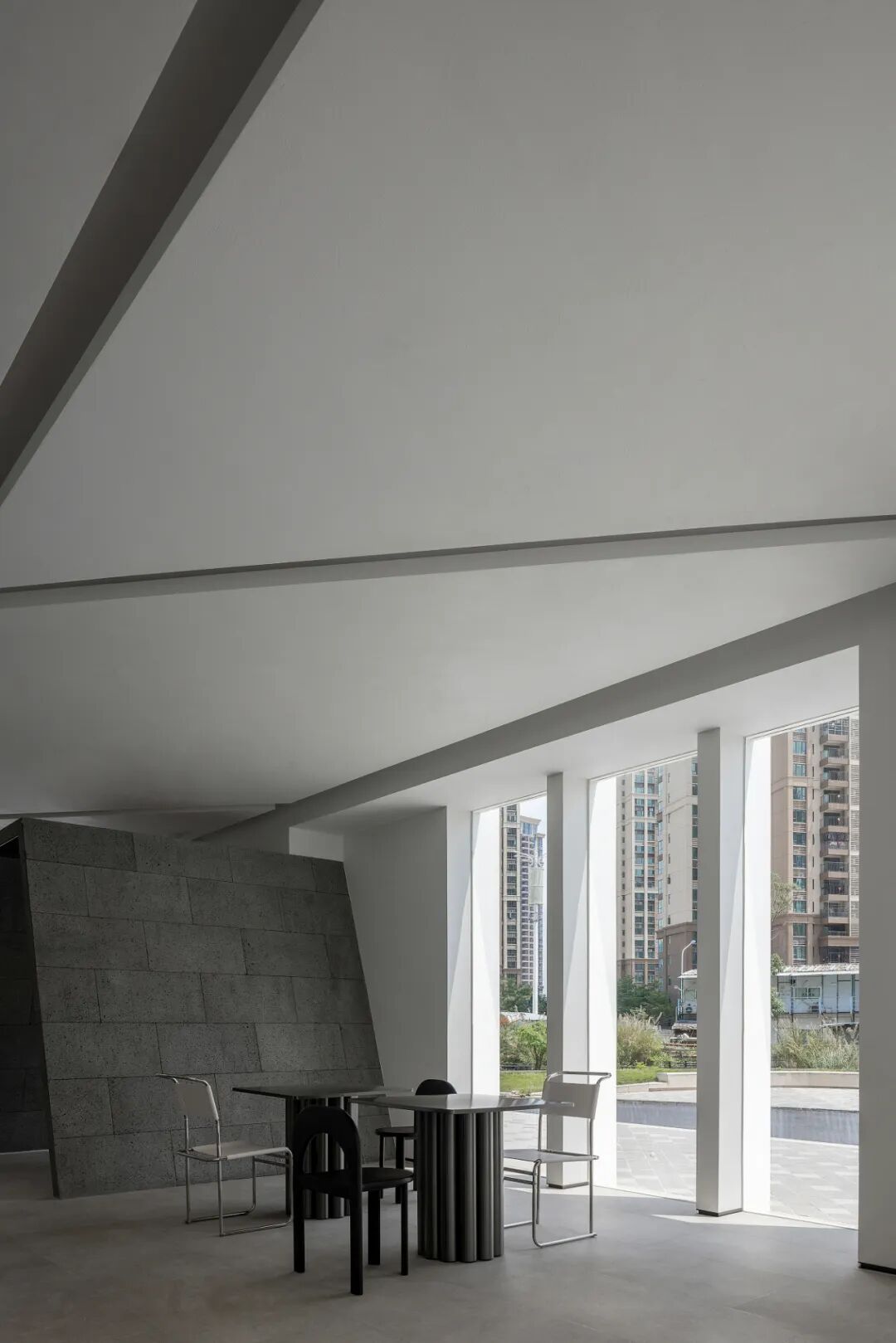 线条流畅的黑白配色桌椅巧妙地融入室内空间的布置与视线流动之中,分散而有序。顾客可以选择坐在明亮的落地窗边,室内外风景一览无余,微风、空气与四季流转也一并被带入,感受空间的通透与舒适惬意;当然也可以选择一处稍显僻静的角落,凭靠着纯粹的白色矮墙,安静的享受食物的美好。