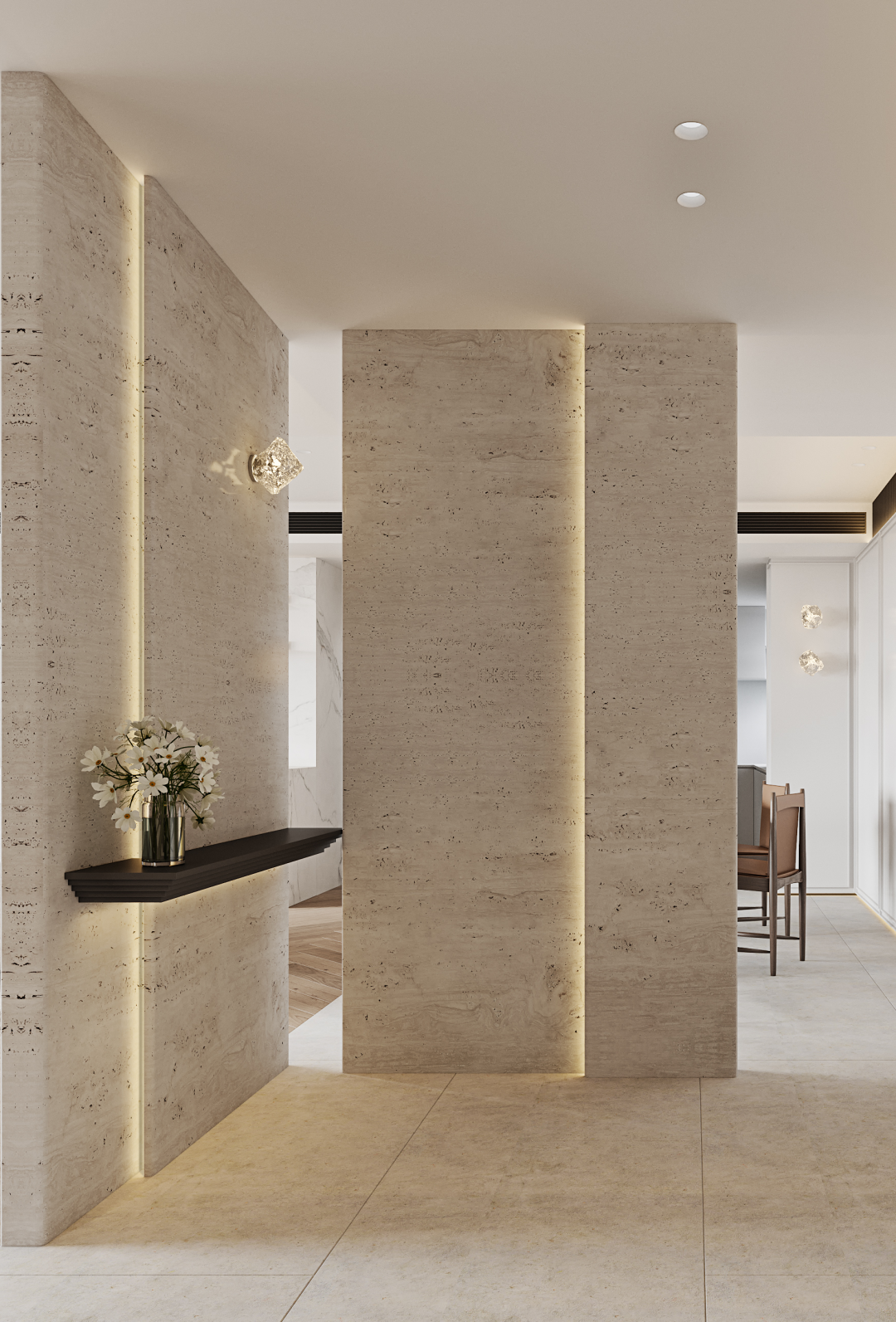 建筑主体由梁柱结构所支撑,借助原始纵深跨度的优势,洞石覆于不同的层次结构,延展至其他块面,形成统一的可视界面。