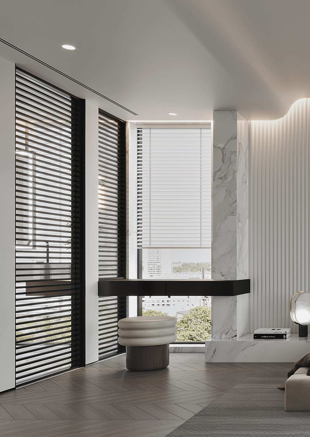 极简主义风格的卧室,使用白色作为空间的主色调,格栅块面的拼接有着一定的延伸感和空间感,石材呈现丰富天然的肌理和感知层次,充盈着淡然的简奢之美。