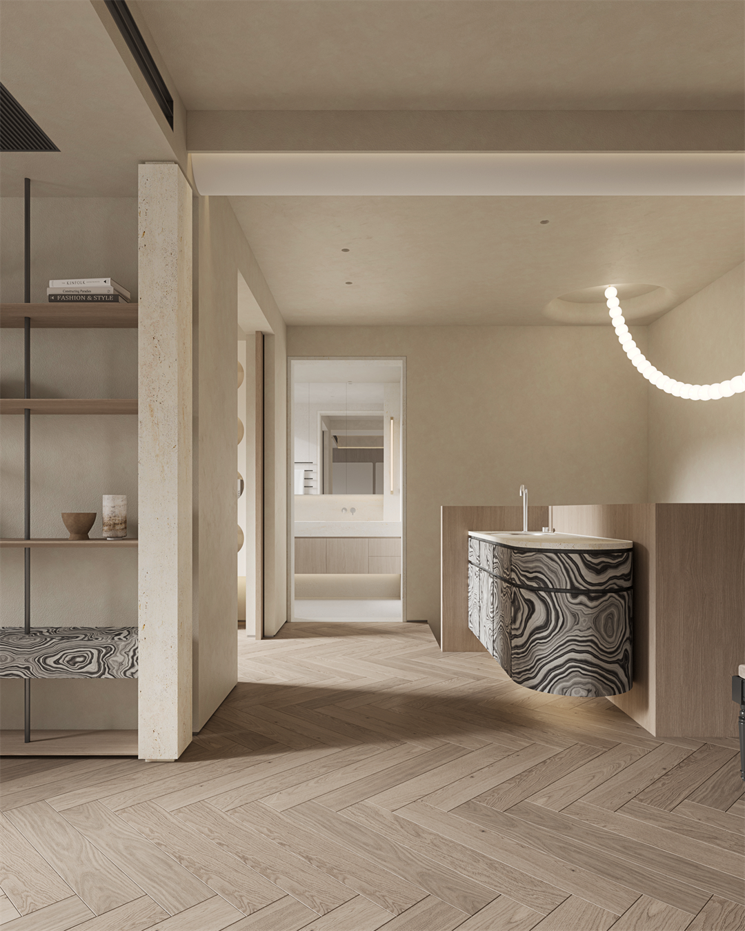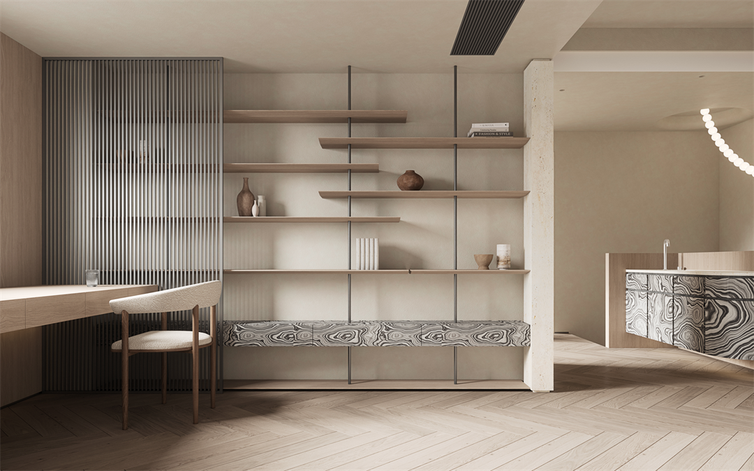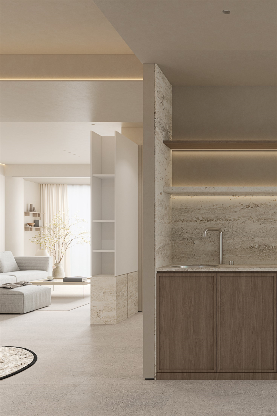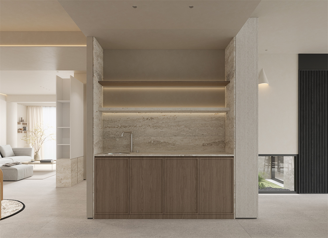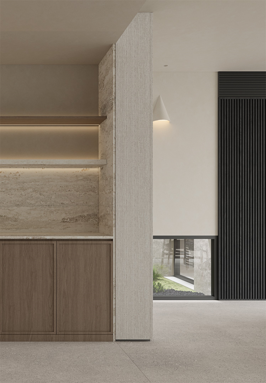 顶部与梁位结构形成错落关系的同时,处理块面的组织架络,延伸至地材的分界线,天然洞石的肌理与自然木饰面板材融合,保持空间连贯性。