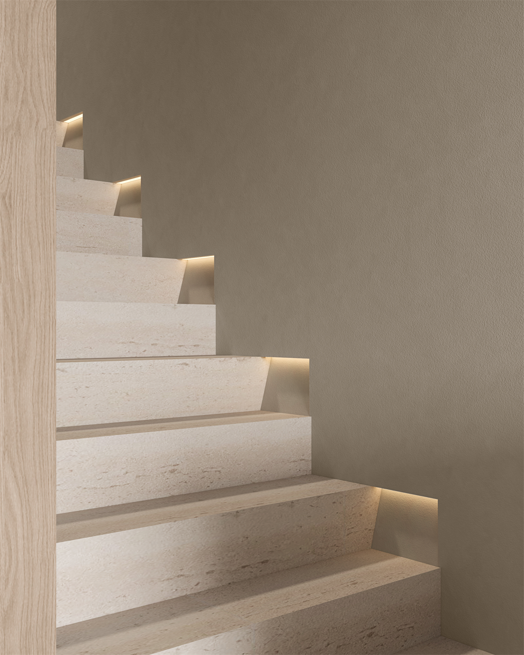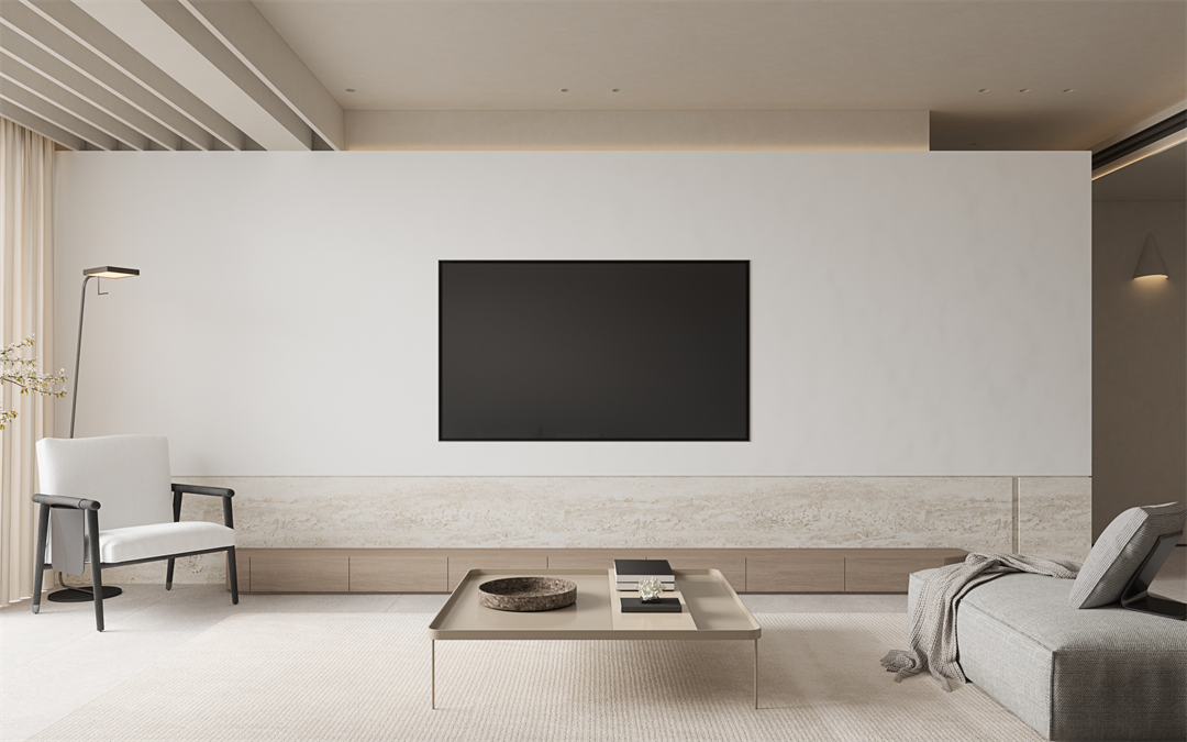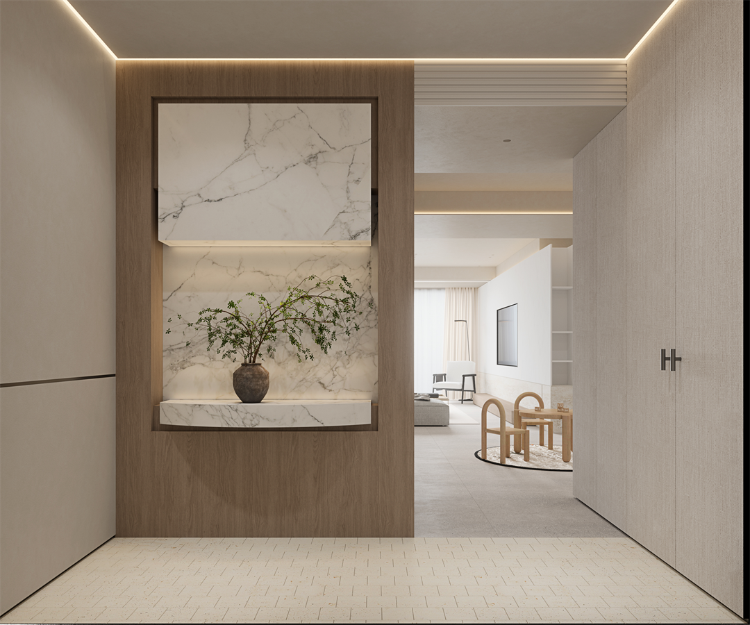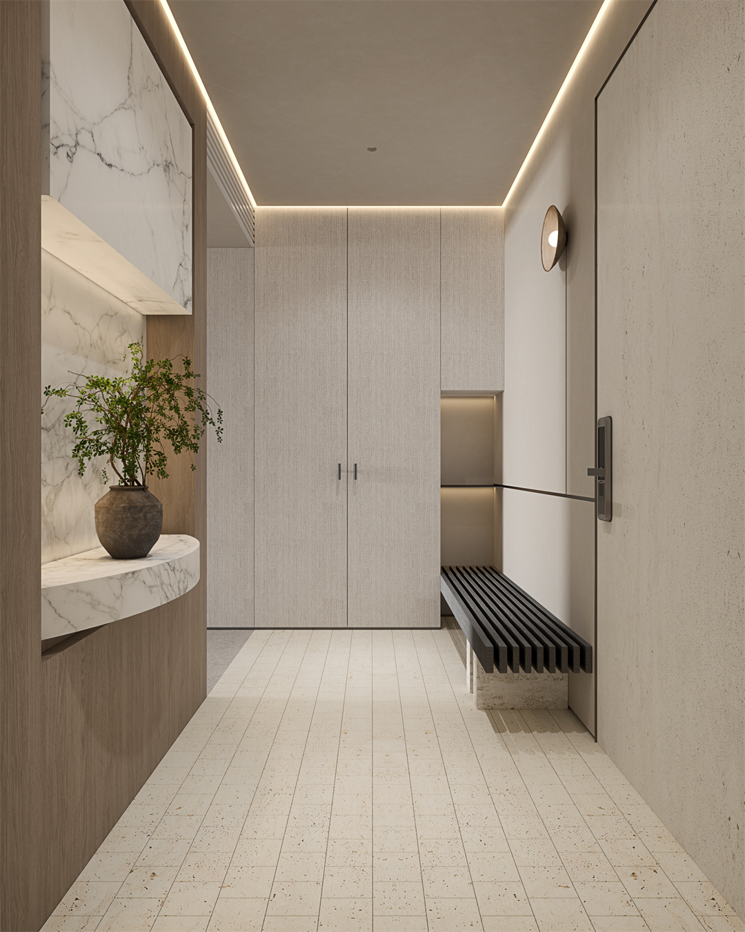 顶部与梁位结构形成错落关系的同时,处理块面的组织架络,延伸至地材的分界线,天然洞石的肌理与自然木饰面板材融合,保持空间连贯性。