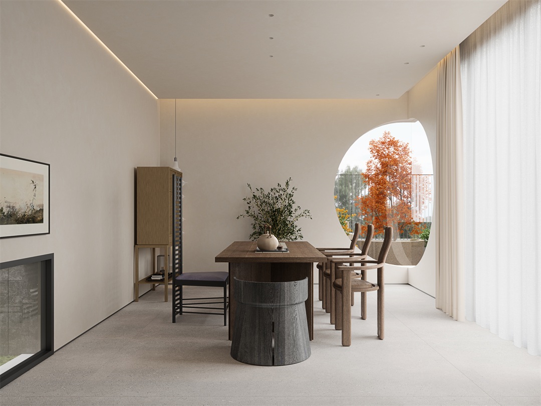庭院秋枫引入室内融为一体,伴随窗外的落日余晖,品茗茶香、细细品味着当下的悠然光景。