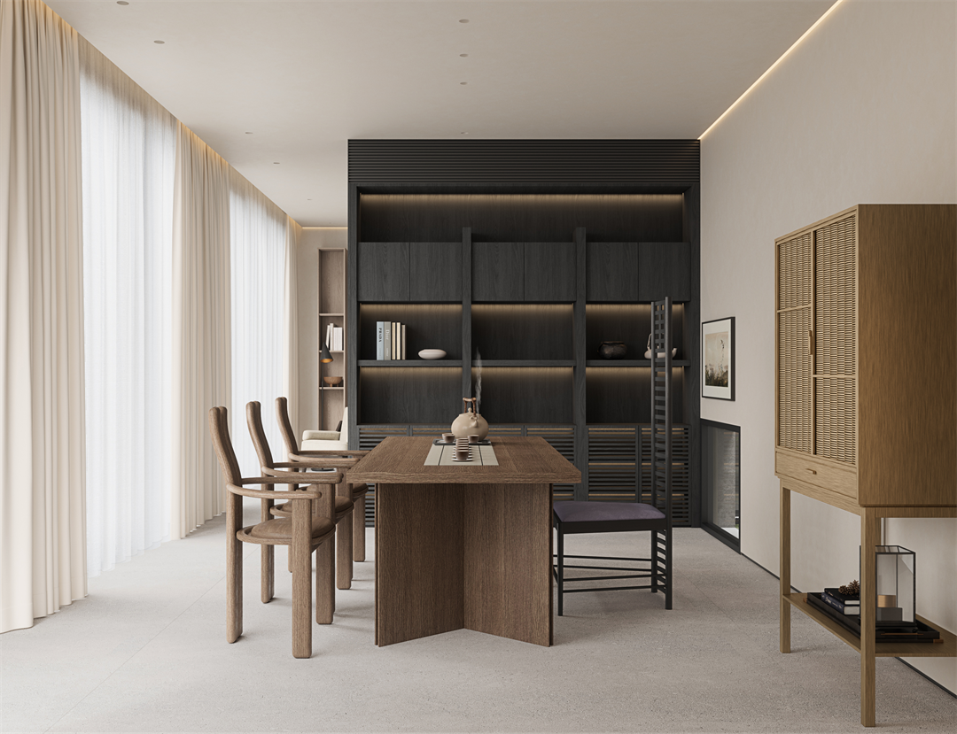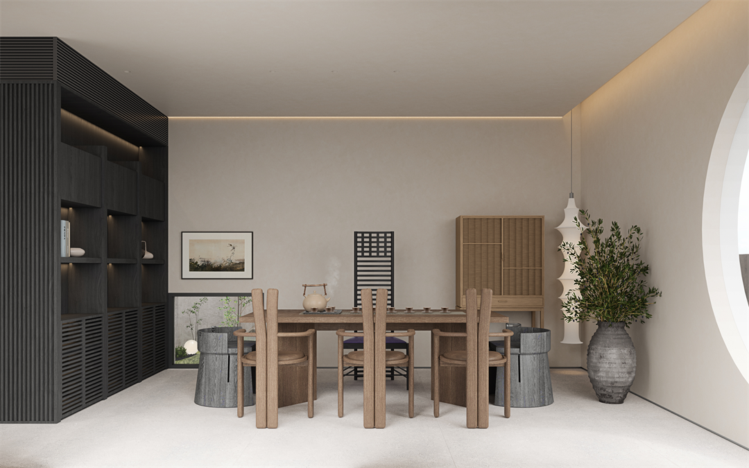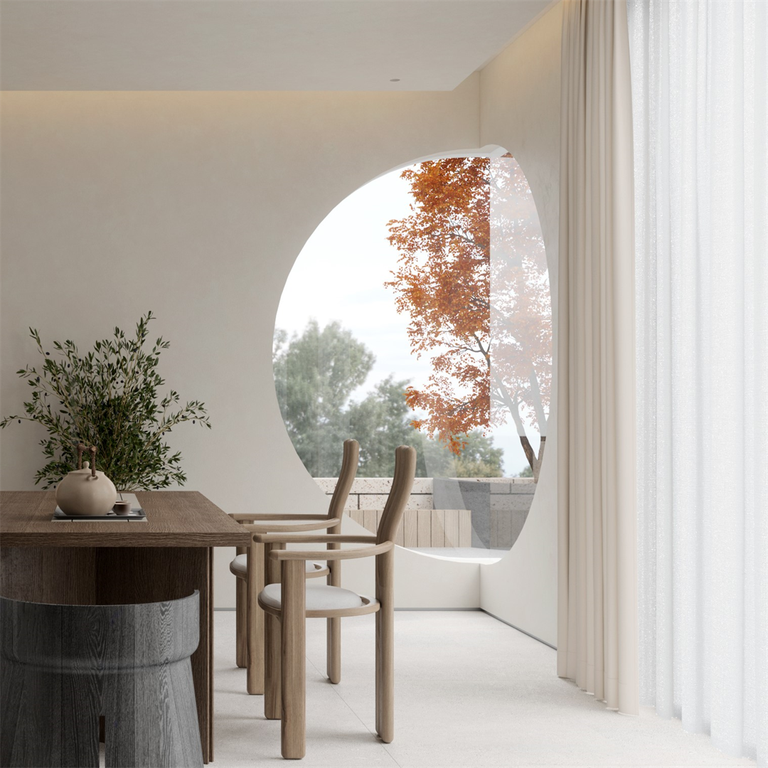 The autumn maple in the courtyard is introduced into the interior and integrated. With the sunset outside the window, you can taste the tea fragrance and the leisurely scene.
