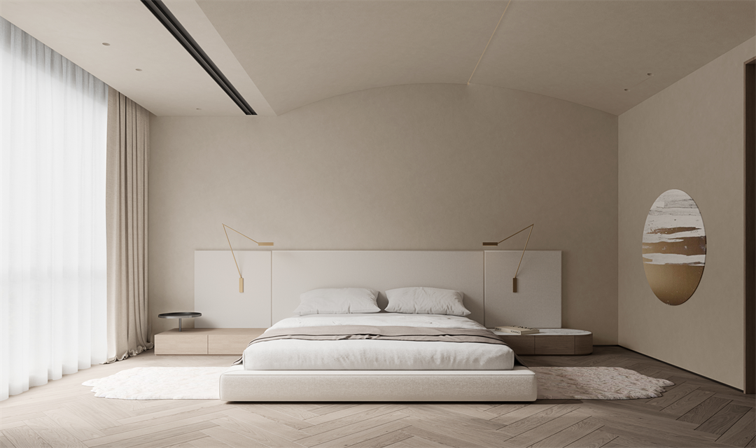 弧形的天花处理与长形的块面融合,在视觉上有着一定的延伸感,搭配鱼骨橡木地面和亚麻质地,营造温润而柔和的空间氛围。