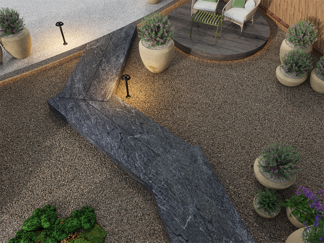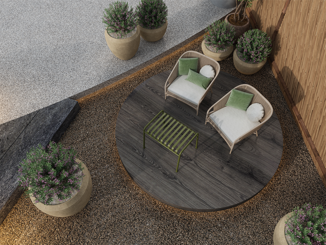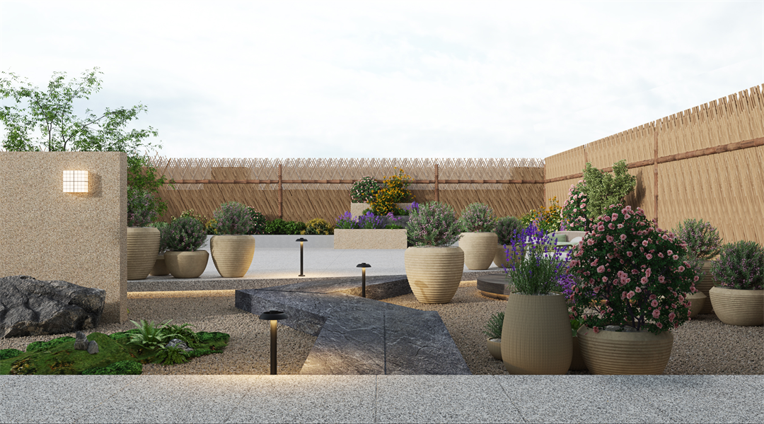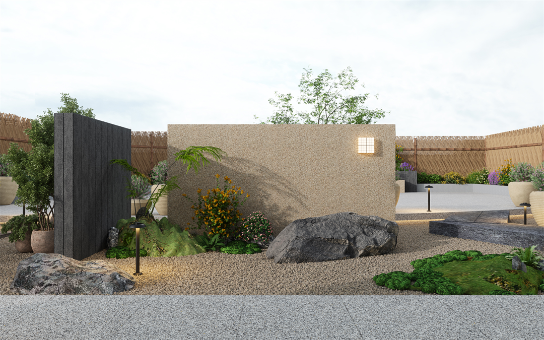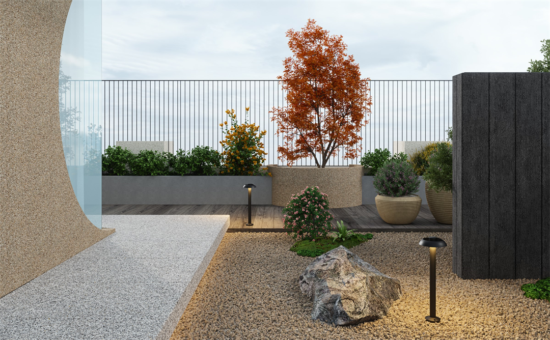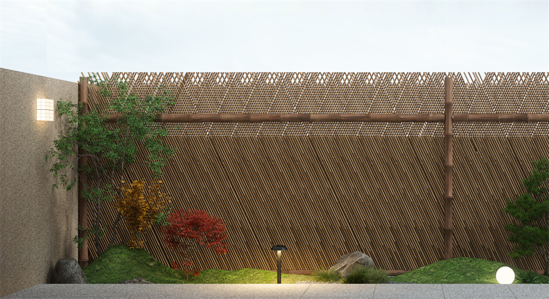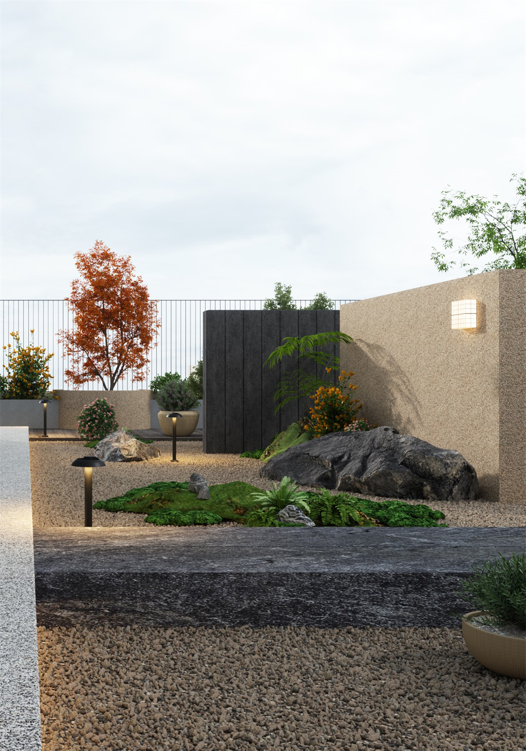 庭院设计通过一堵水洗石与风化木垒砌的矮墙与中式庭院造景相融合,自然的风光结合浓厚的材质肌理,让居者对自然与人的关系有了更深远的体会,繁华都市内独属这一片山野绿意