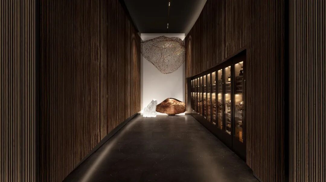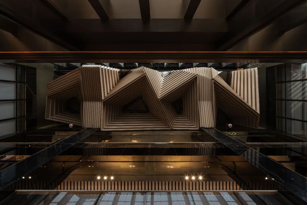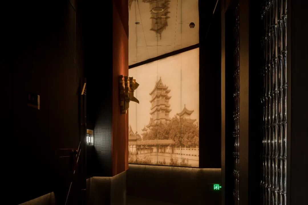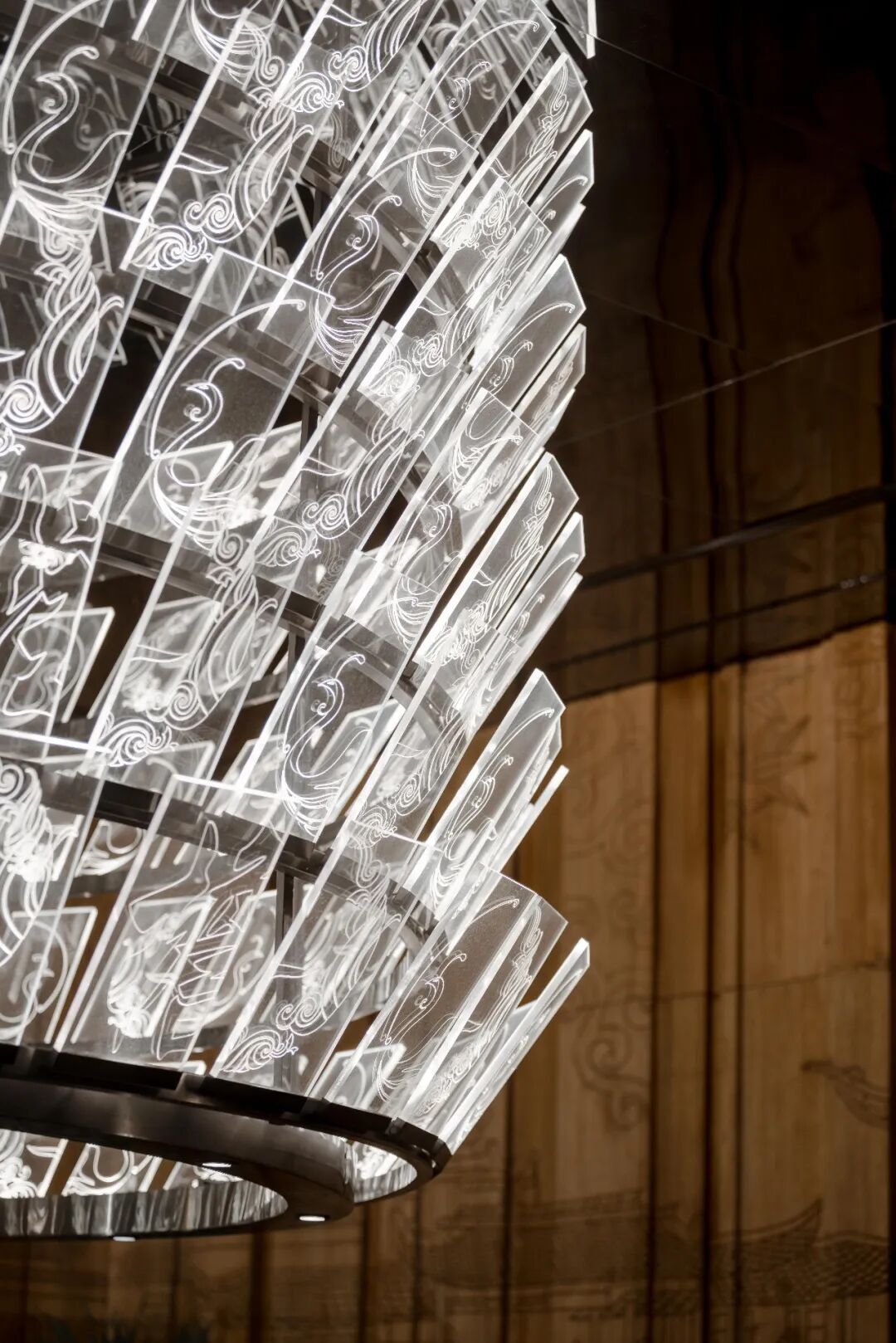 建筑空间处处藏满了东方美学玄机:滕阁王、仙气黄鹤、星天象心阁......依据古代恢弘大气的亭台楼榭为灵感,将中国诗词里的古典建筑复原。其次,器物、色调的布局也古色古香,靛蓝、胭脂、赤金、玄青,东方水墨色在透光楼阁线条中穿梭,兽首的摆件与空中飞舞的凤凰灯让时空交织。蓦然回首,汉代瓦当的构成与赤金斗拱的点缀,在深幽的长廊中述说着“工匠”的传奇。