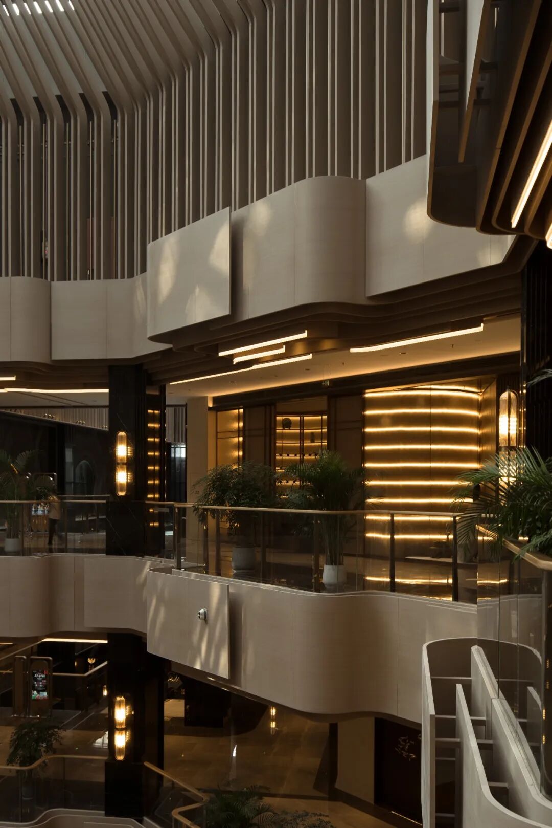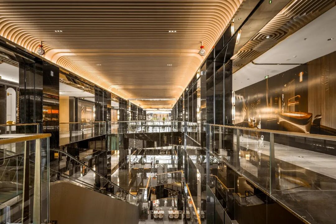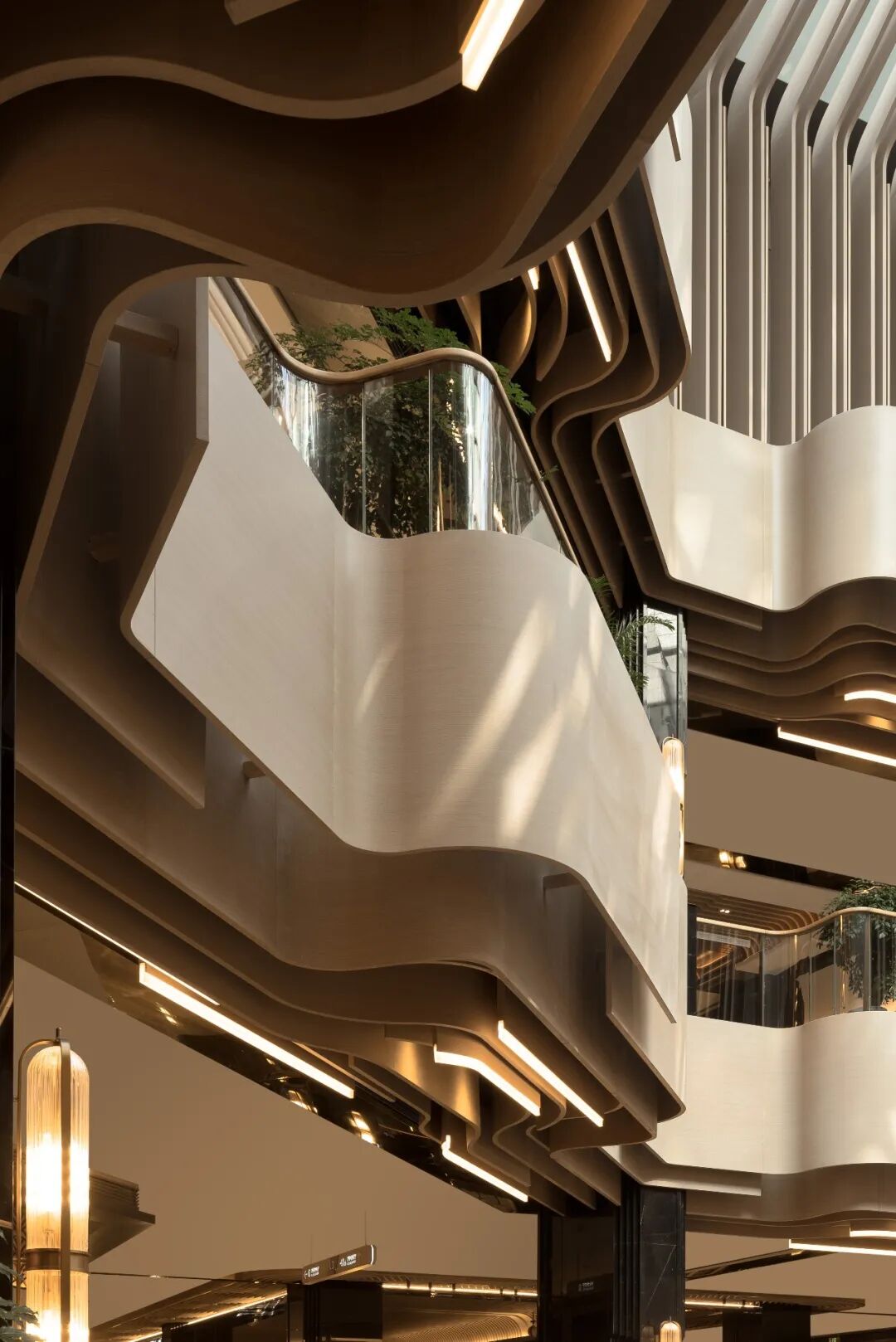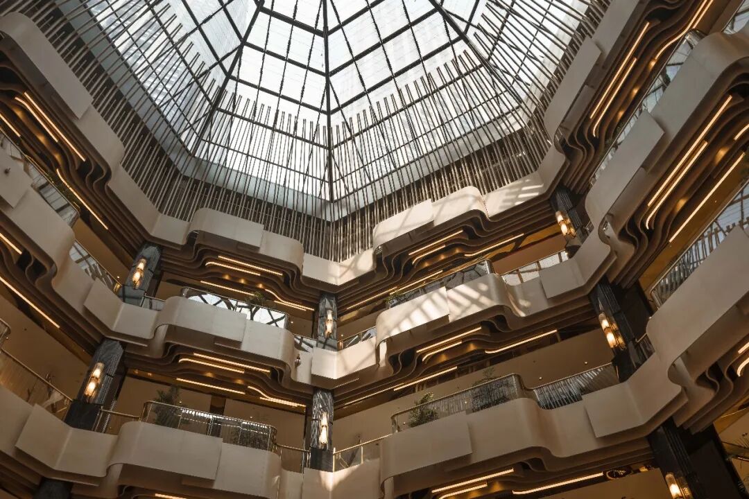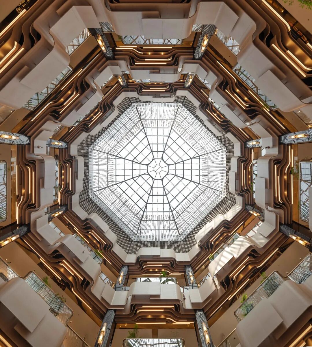 在中国华商的空间设计中,处处融合东方的经典元素,如十字动线设计、交界点的八角中庭,行云流线型的回廊外墙,以及从东方宅院的天井汲取灵感而来的星空穹顶,光晕从空中垂坠,呈“回”字形环形旋转,似乎是在讲述一个关于“团圆”的故乡事。
