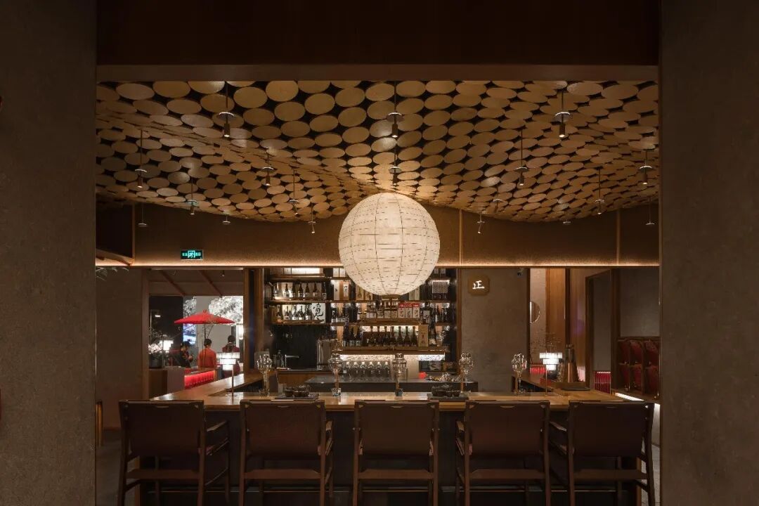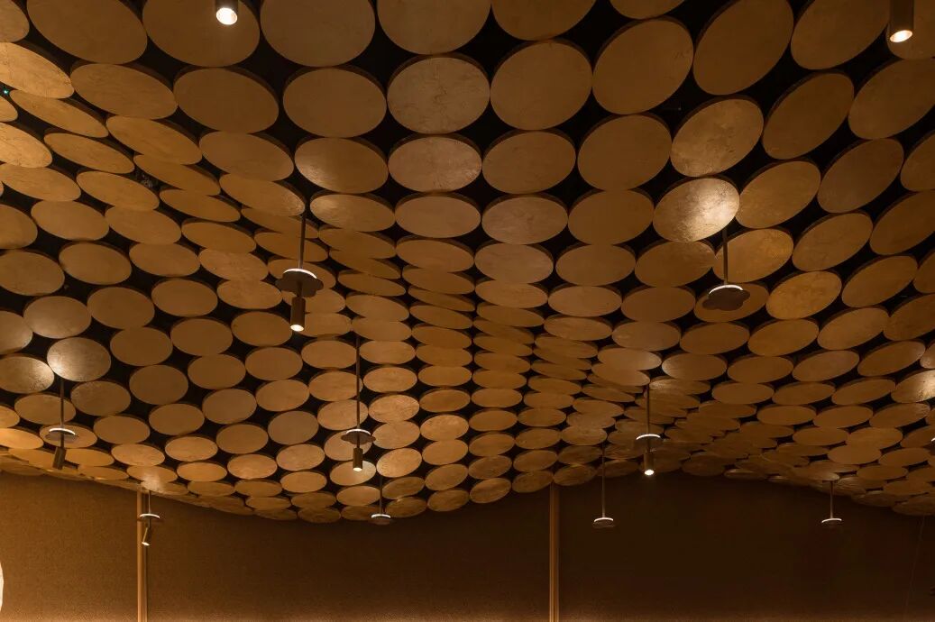 空间里的美学细节,都无处不在展示着大唐的雍容大气,板前以一轮明月呈现“莫使金樽空对月”的洒脱之势,而门店顶部则是以手工黄铜片打造“黄河之水天上来”的雄浑气概,古韵十足的茶盘杯盏,也在劝罢宾客浊酒一杯,忘却烦忧。