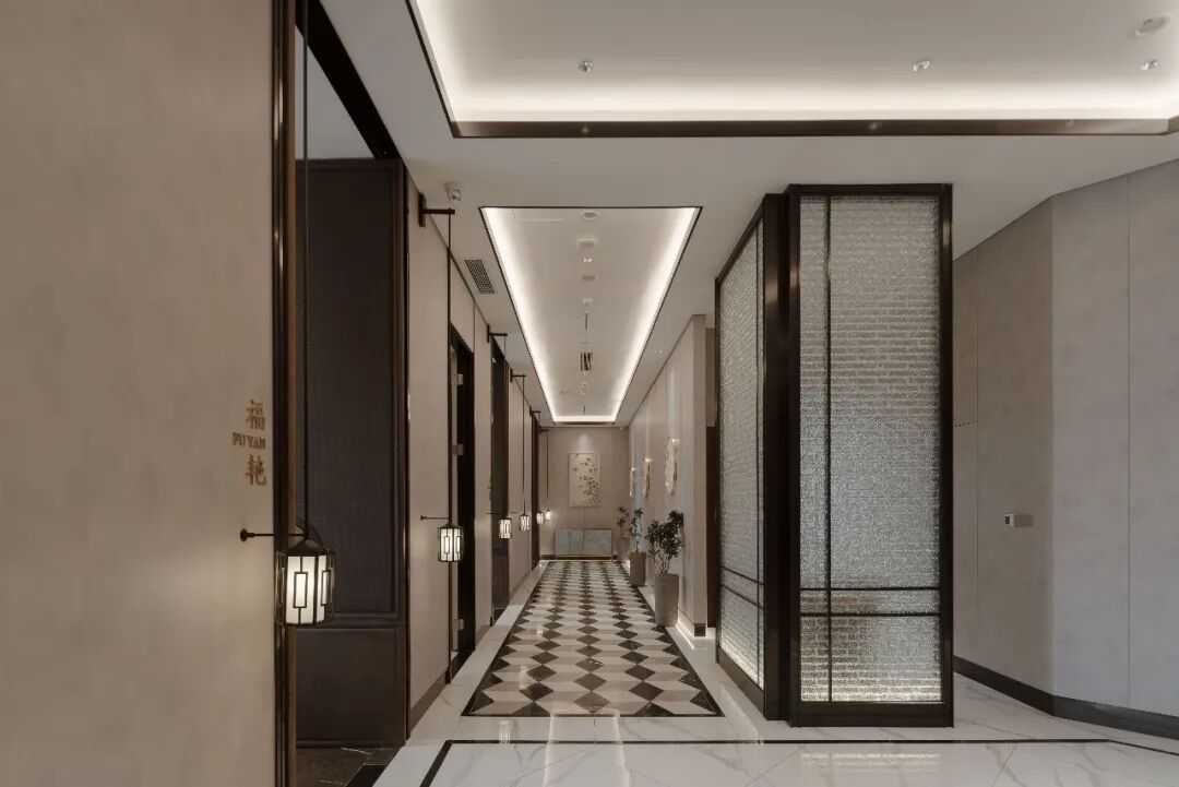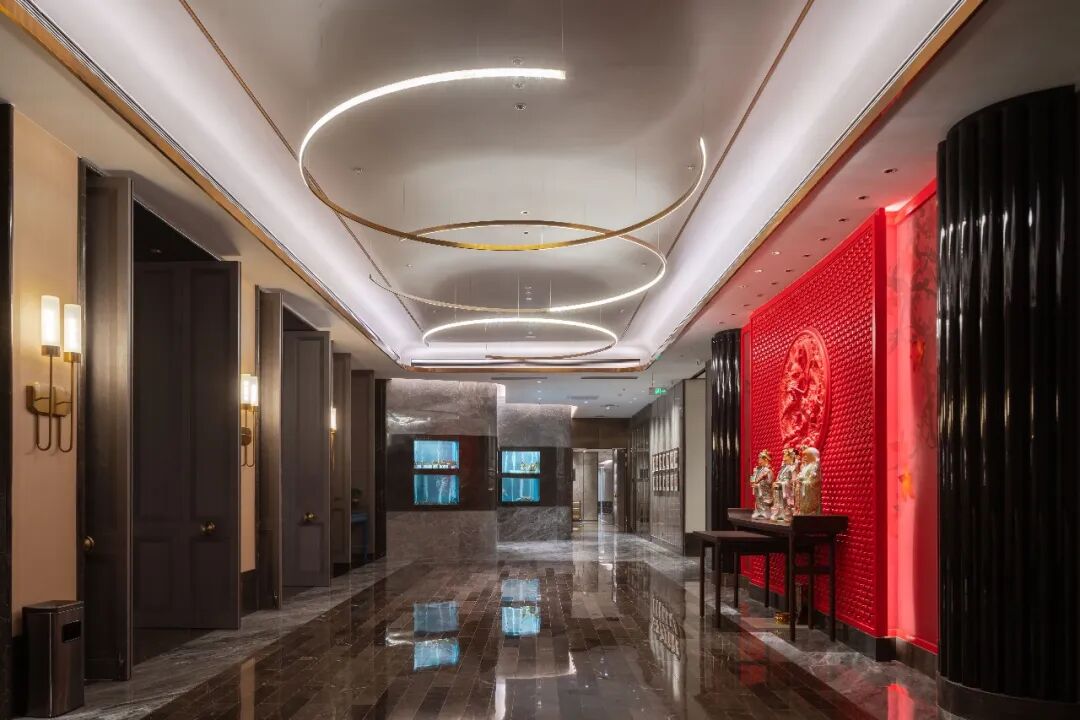 为了满足熙熙攘攘的食客,约5米宽的走廊,满足合家欢乐的一家人并排行走;大理石铺就的地砖和墙面,也处处彰显着低调的奢华,颇具南洋风格的长柱壁灯,以内收的含蓄光影,点亮一座遍地珍馐的美食梦境。