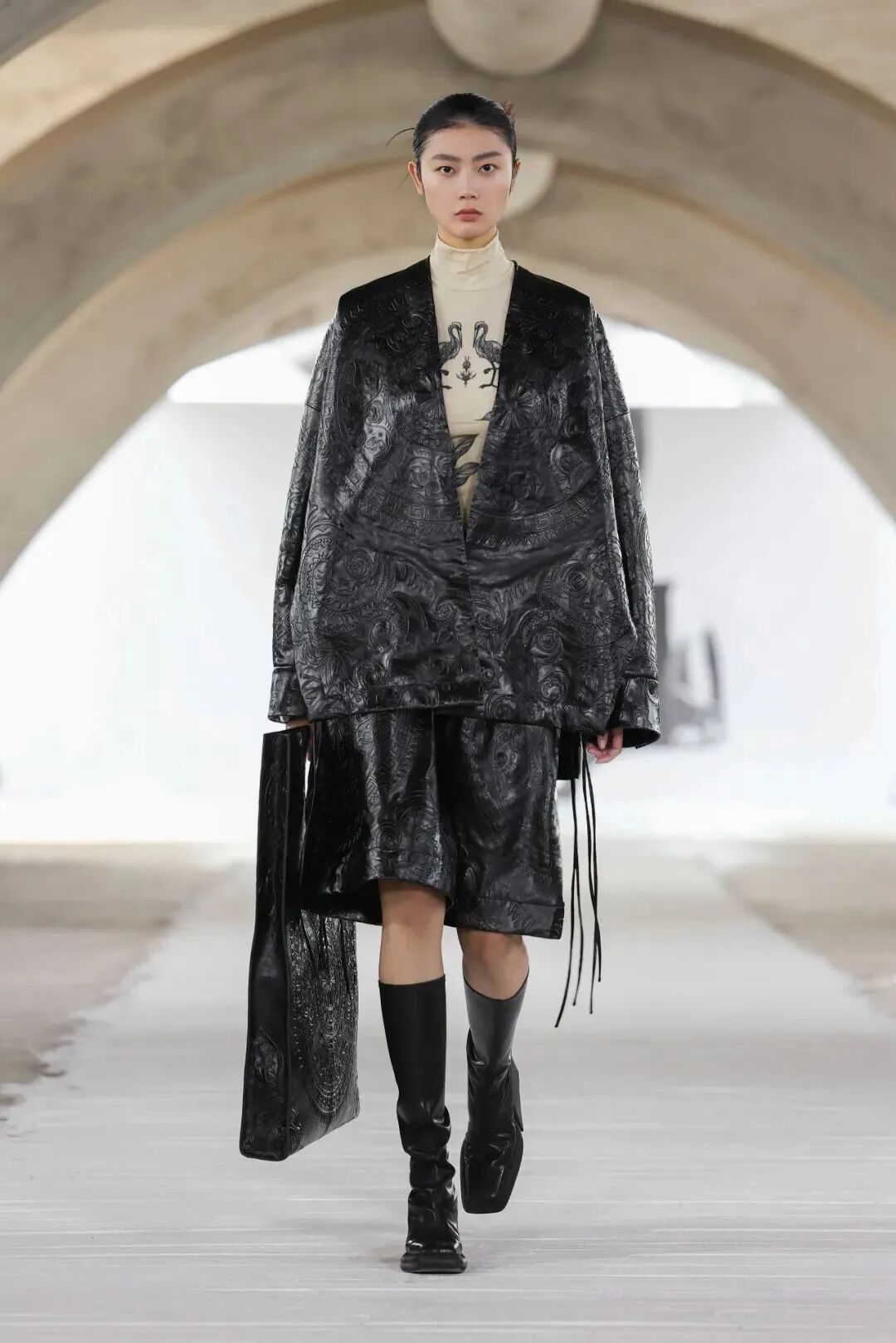 ZHUCHONGYUN2022秋季系列中,以大地色为基调,点缀金色、飘带、流苏,并融合民族服饰元素,白鹤、山水、串珠、重工刺绣等,融合呈现在极简的廓形结构职中,保留了东方的庄严感。