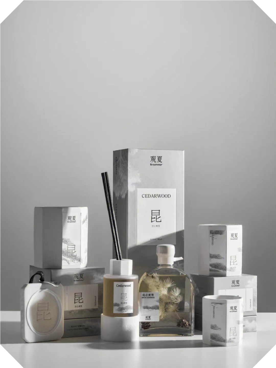 创立于2018年的国产香薰观夏,算得上东方文化品牌的中流砥柱,观夏的经典产品颐和金桂、西溪桃花、昆仑煮雪、书院莲池,从名字开始构造东方意象。在“祥云”车载香氛、“游云融蜡灯”等产品外观增添东方气韵。
